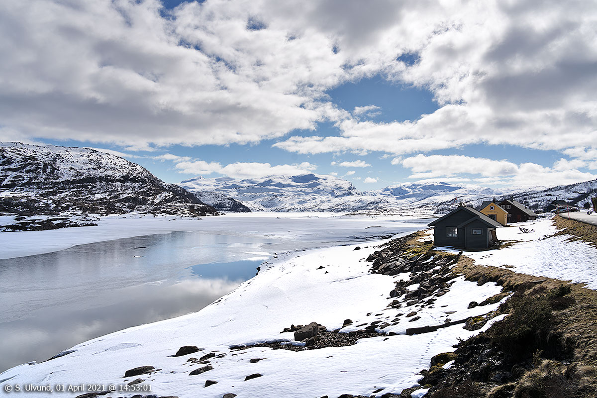 Hamlagrøvatnet sett frå Bjørndalen, 01. april 2021, 15:07 (Panorama)