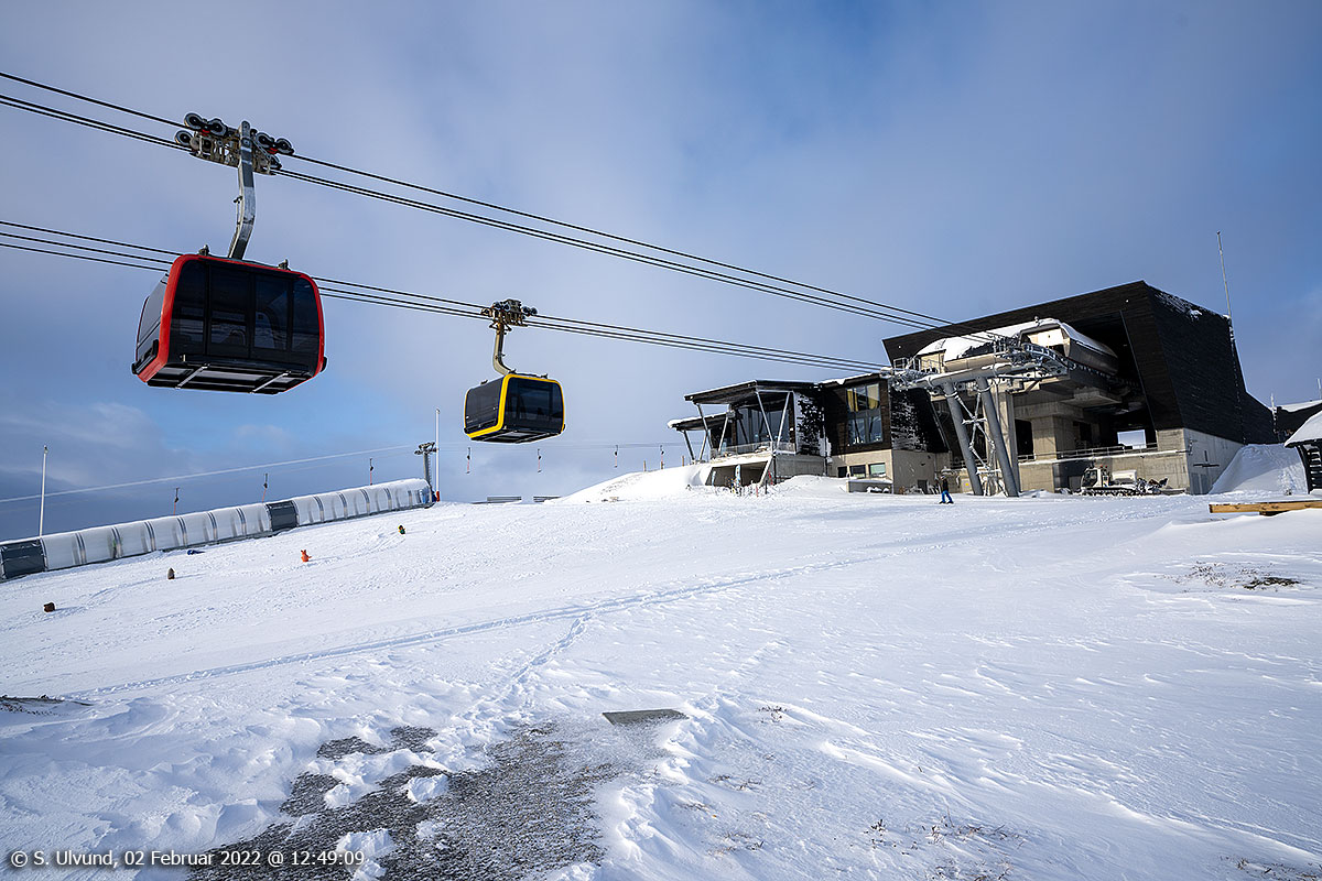 Hangurstoppen mot Voss Gondol og Hangurstoppen Restaurant, 02. februar 2022, 12:49, -6C (Hanguren, Voss)