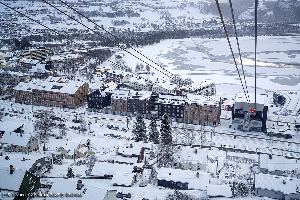 Knutepunkt Voss, Scandic Voss, Voss Gondol og Voss Stasjon sett frå Voss Gondol, 02. februar 2022, 13:14 (Voss)