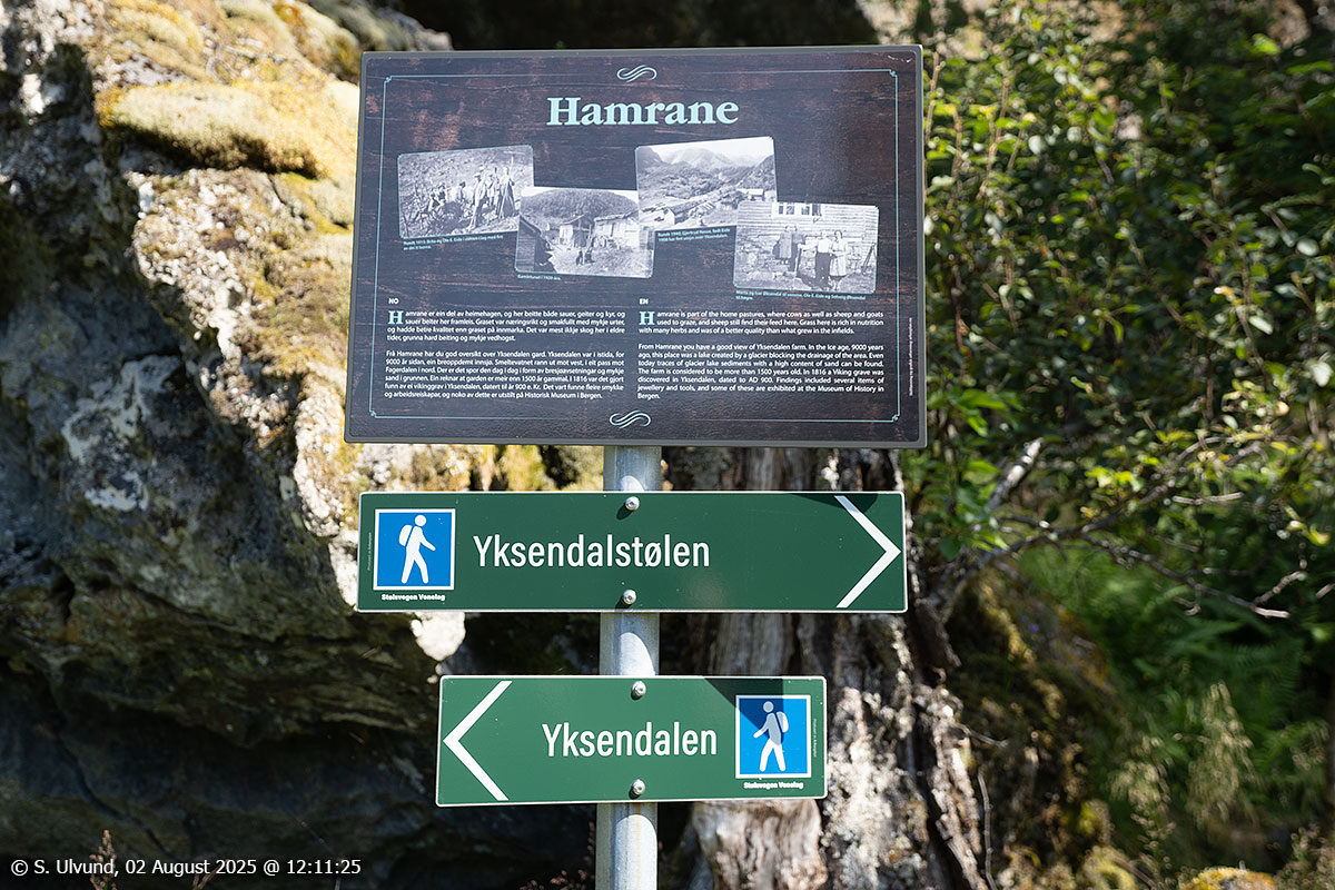 Frå Hamrane har du god oversikt over Yksendalen gard. Yksendalen var i istida, for 9000 år sidan, ein breoppdemt innsjø. Smeltevatnet rann ut mot vest, i eit pass mot Fagerdalen i nord. Der er det spor den dag i dag i form av bresjøavsetningar og mykje sand i grunnen. Ein reknar at garden er meir enn 1500 år gammal. I 1816 var det gjort funn av ei vikinggrav i Yksendalen, datert til år 900 e.Kr. Det vart funne fleire smykke og arbeidsreiskapar, og noko av dette er utstilt på Historisk Museum i Bergen