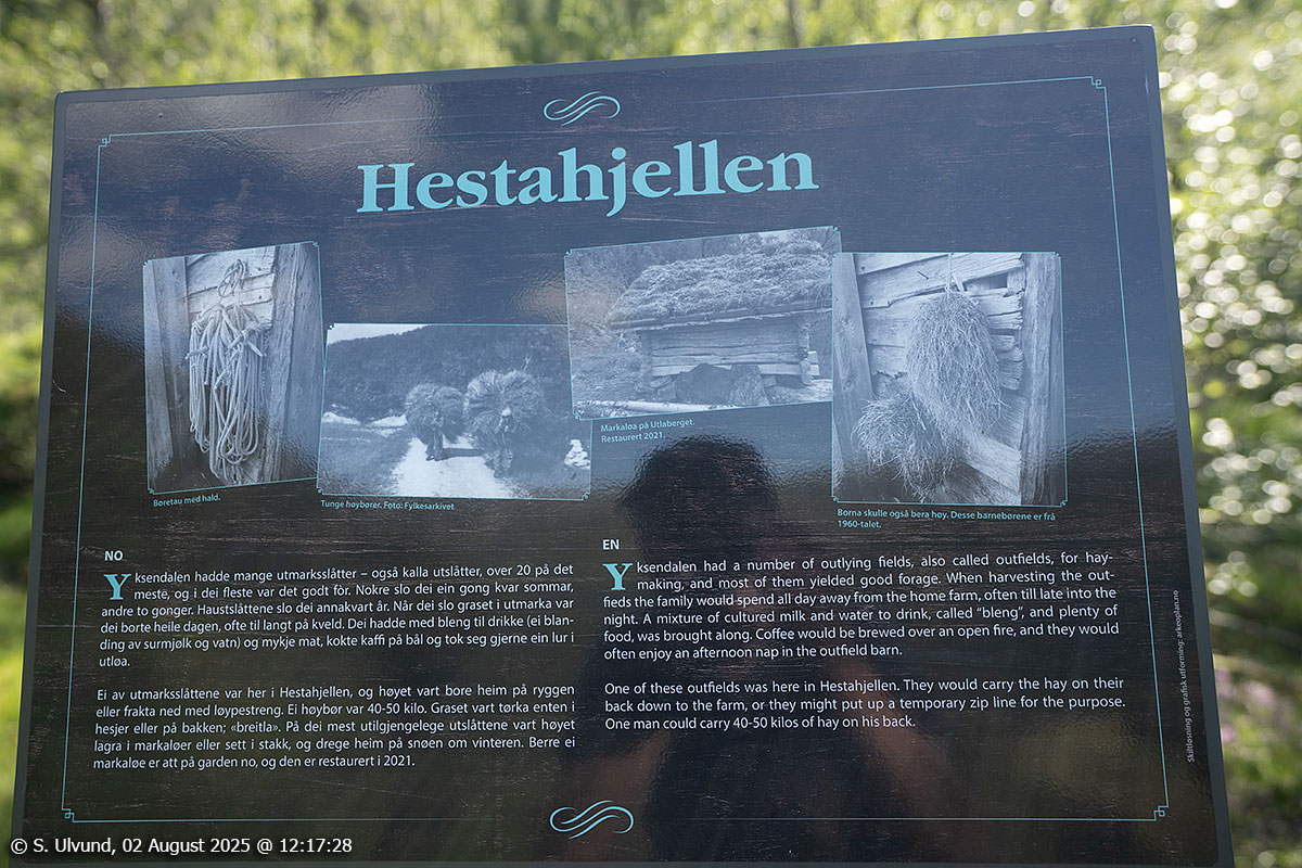 Ei av utmarksslåttene var her i Hestahjellen, og høyet vart bore heim på ryggen eller frakta ned med løypestreng. Ei høybør var 40–50 kilo. Graset vart tørka enten i hesjer eller på bakken; «breitla». På dei mest utilgjengelege utslåttene vart høyet lagra i markaløer eller sett i stakk, og drege heim på snøen om vinteren. Berre ei markaløe er att på garden no, og den er restaurert i 2021.