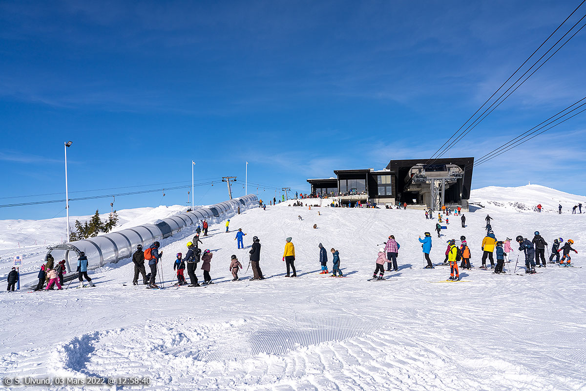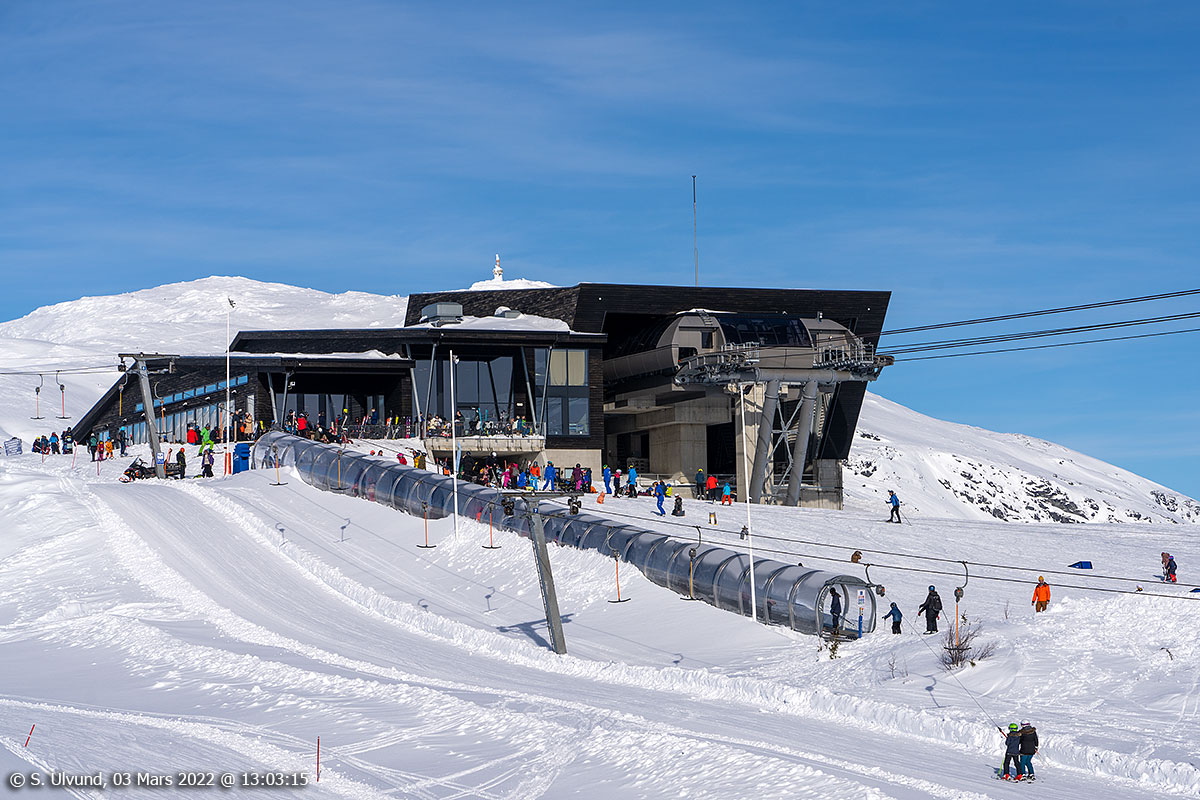 Trollbakken på Hangurstoppen med Voss Gondol og Hangurstoppen Restaurant bak, 03. mars 2022, 12:58 (Hanguren, Voss)