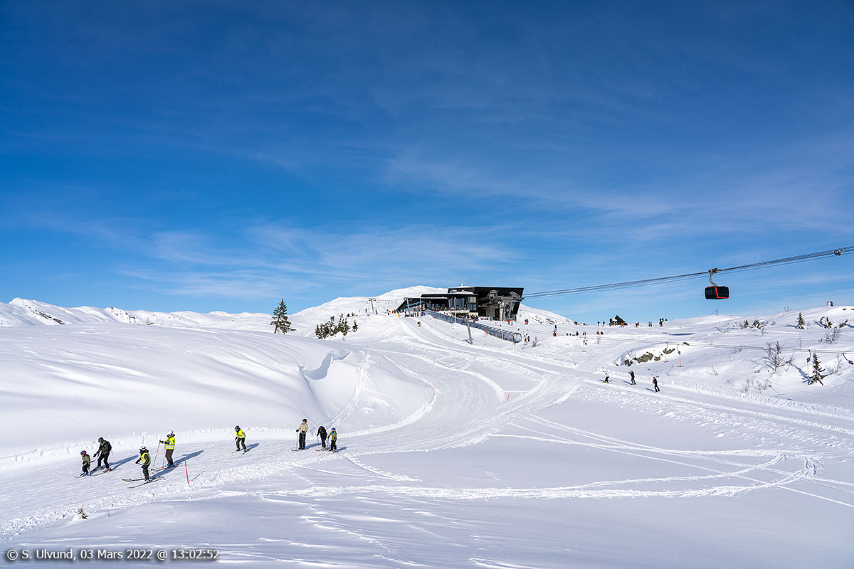 På ski på Hangurstoppen med Voss Gondol og Hangurstoppen Restaurant bak, 03. mars 2022, 13:30 (Hanguren, Voss)
