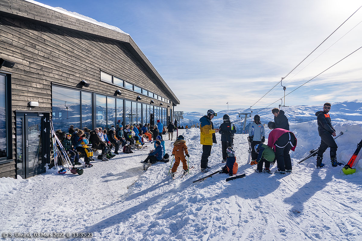 I solveggen utanfor Voss Gondol og Hangurstoppen Restaurant på Hangurstoppen, 03. mars 2022, (Hanguren, Voss)