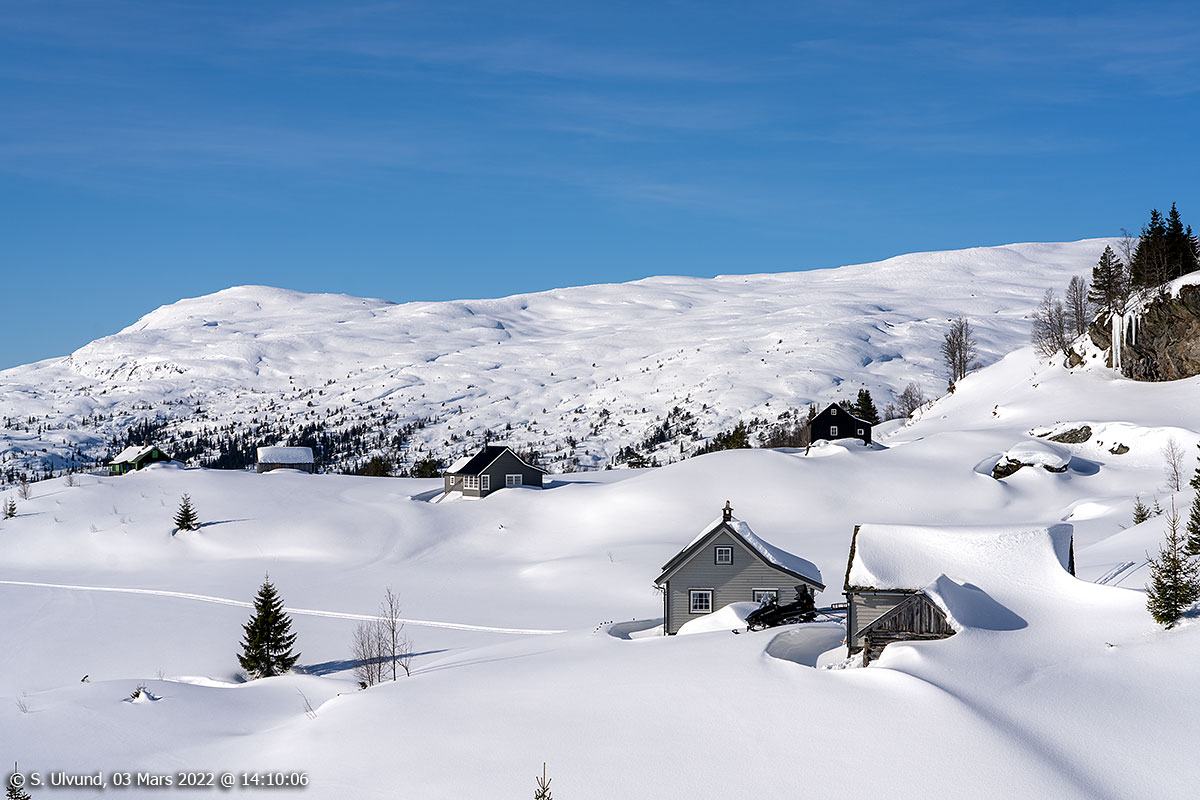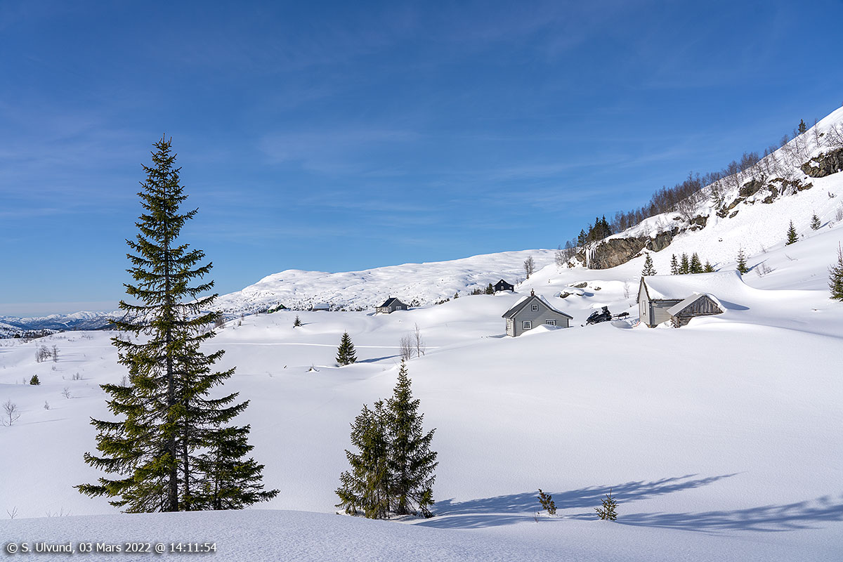 Stølar på Kiseldur med Hodn bak, 03. mars 2022, 14:11 (Voss, Horn)