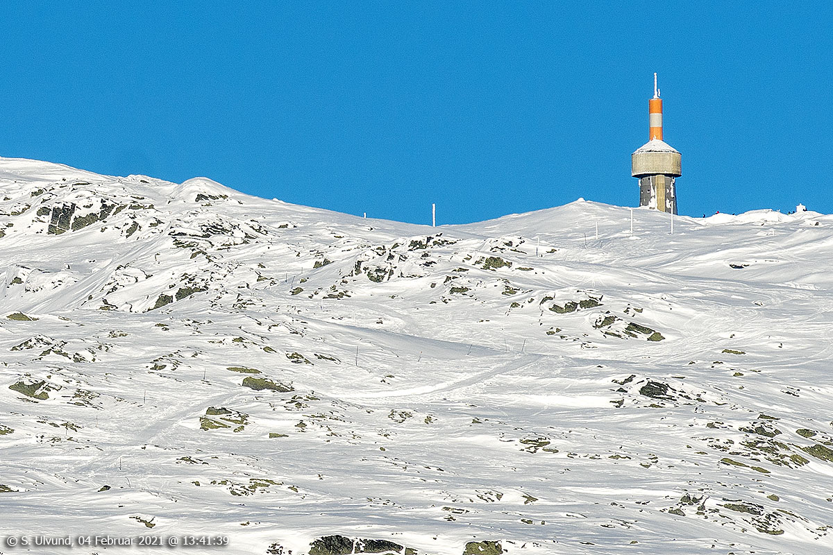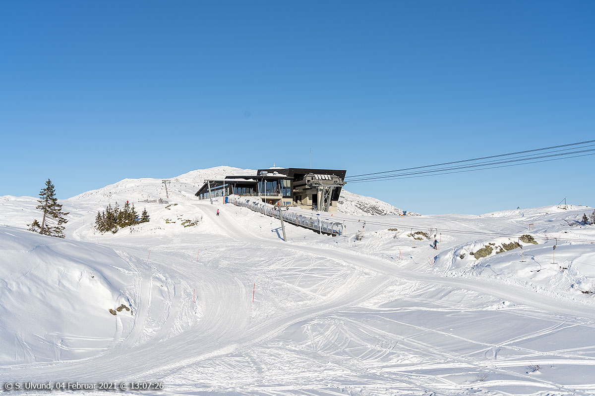 Hangurstoppen mot Voss Gondol og Hangurstoppen Restaurant, 04. februar 2021, 13:07, -13C (Hanguren, Voss)