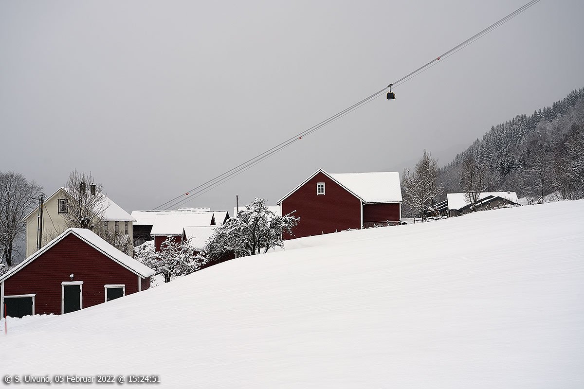 Mølster med Voss Gondol bak sett frå Mølstervegen, 05. februar 2022, 15:24, +1C (Voss)