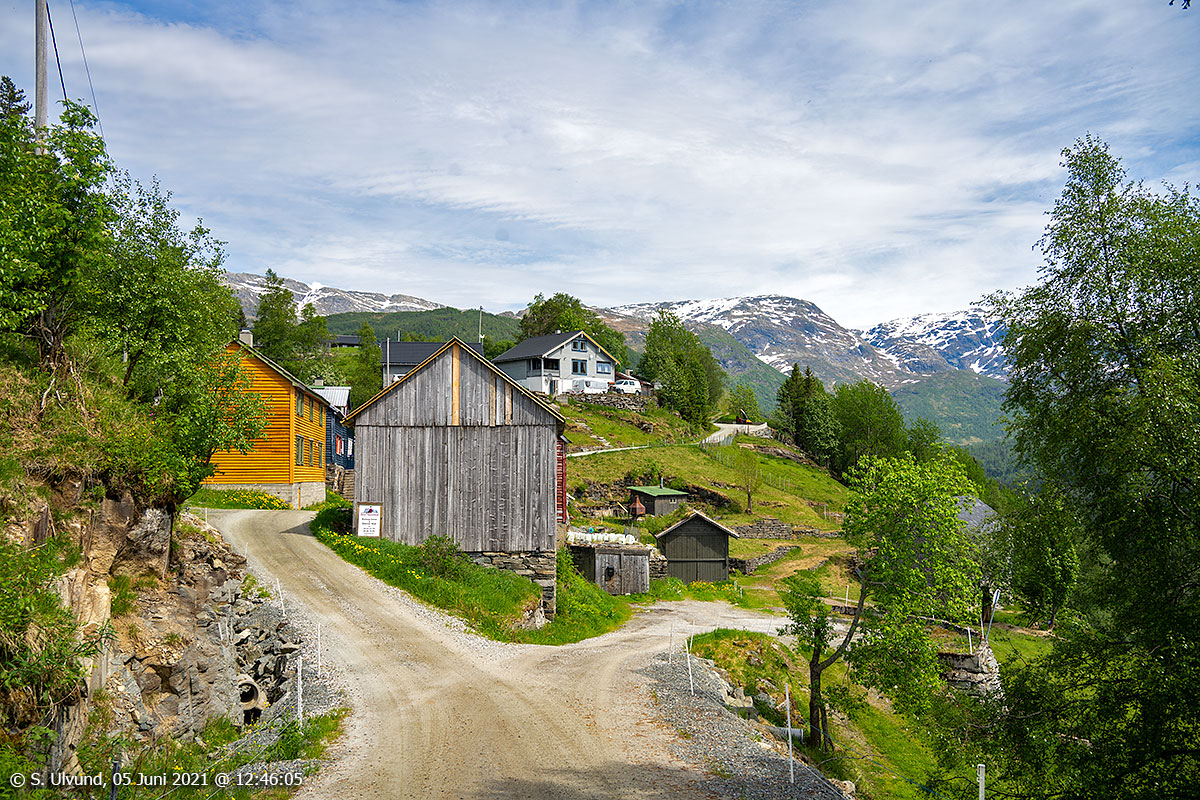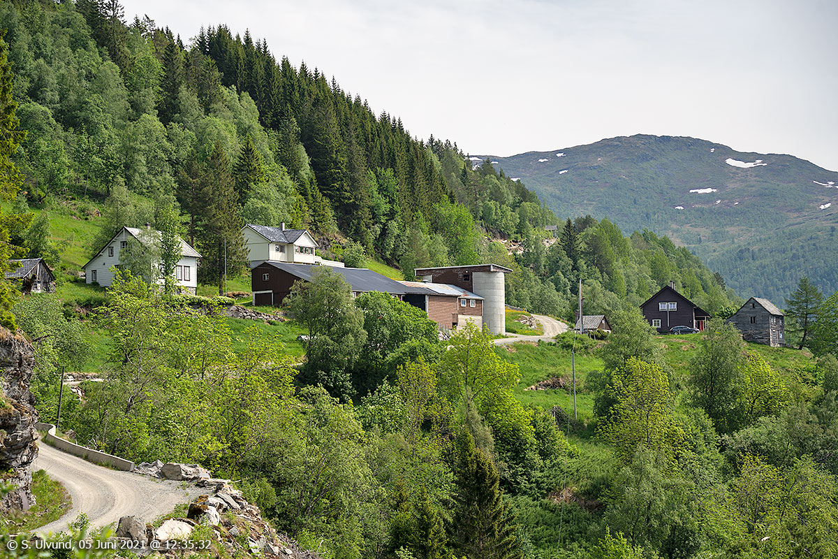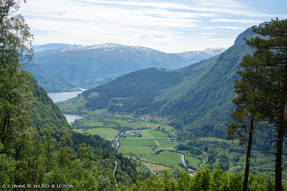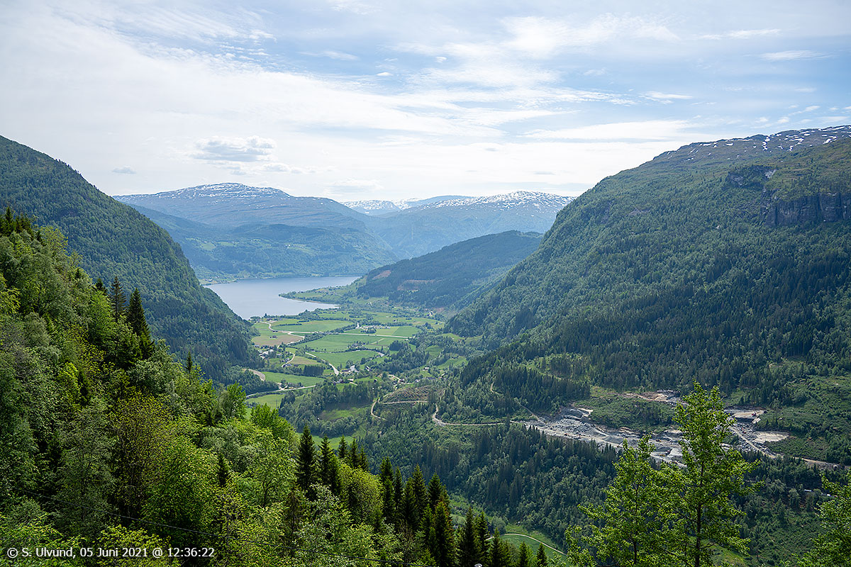 Utsyn nedanfor Kollskår mot Granvinsvatnet og Øvre Granvin, 05. juni 2021, 12:36, +22C (Skjervet Granvin)