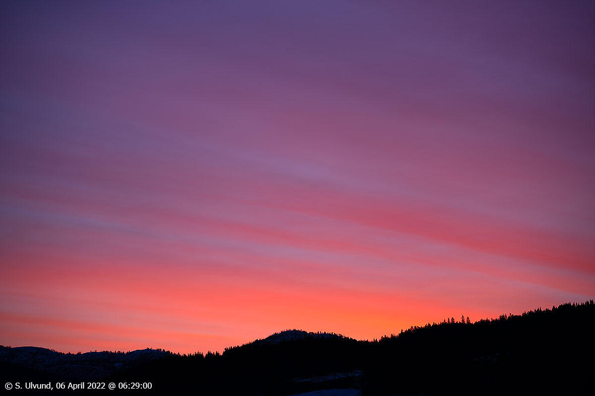 Raud og fin himmel i morgontimane sett frå Skulestadmo, 06. april 2022, 06:29, -4C