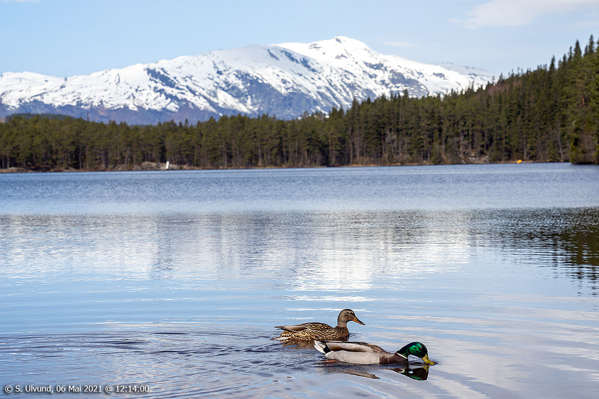 Monsvatnet med Stokkender og Lønahorgi bak, 06. mai 2021, 12:14 (Flatlandsmoen Fauna Fuglar)