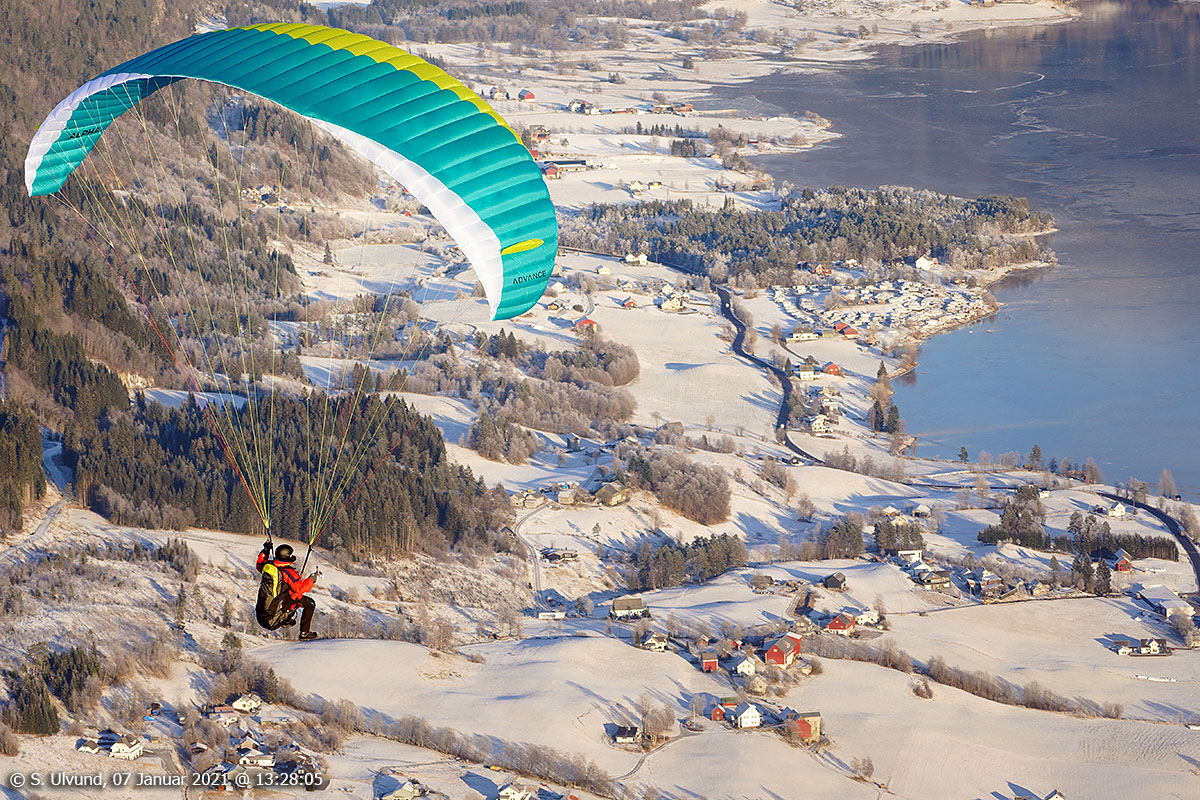 Paraglider i lufta over Skulestadmo sett frå Hangurstoppen, 07. januar 2021, 13:28 (Hanguren)