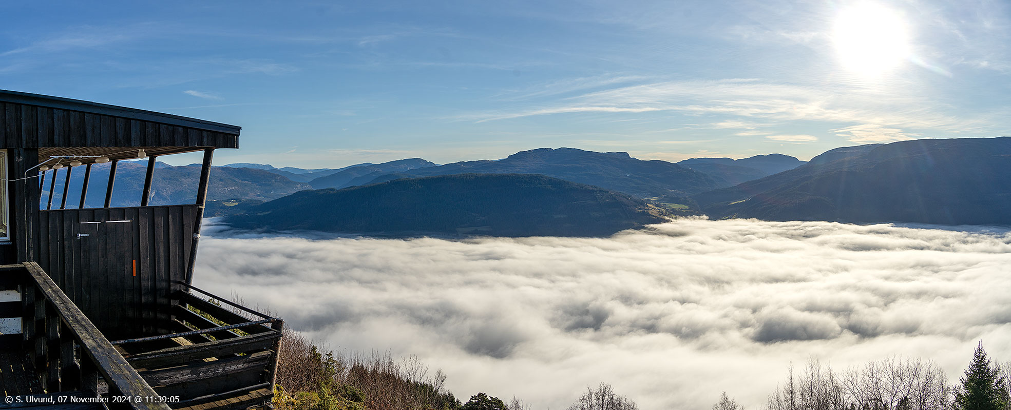 På tur opp i sola på Hanguren og Hangurstoppen medan skodda ligg tjukk over store delar av bygda lenger nede.