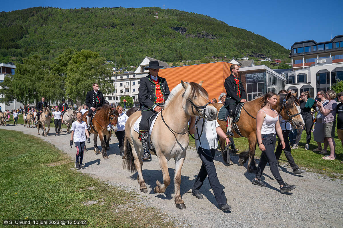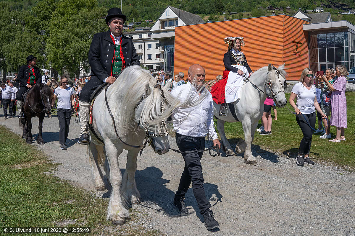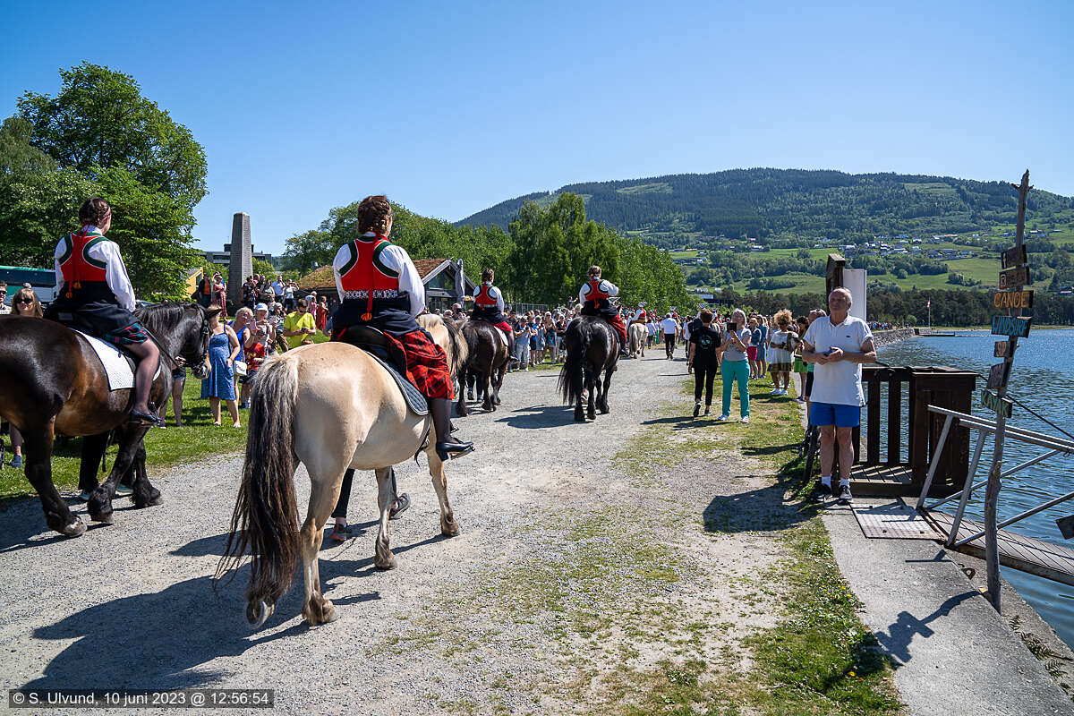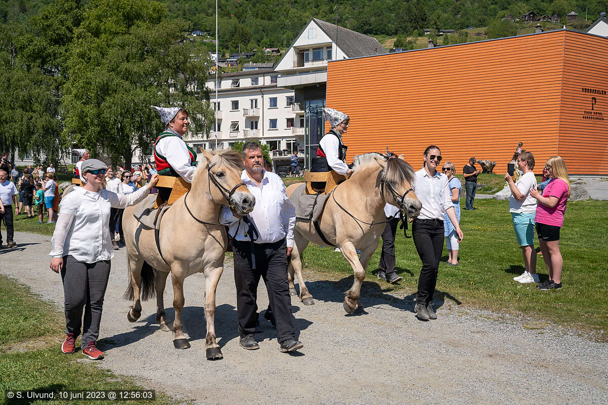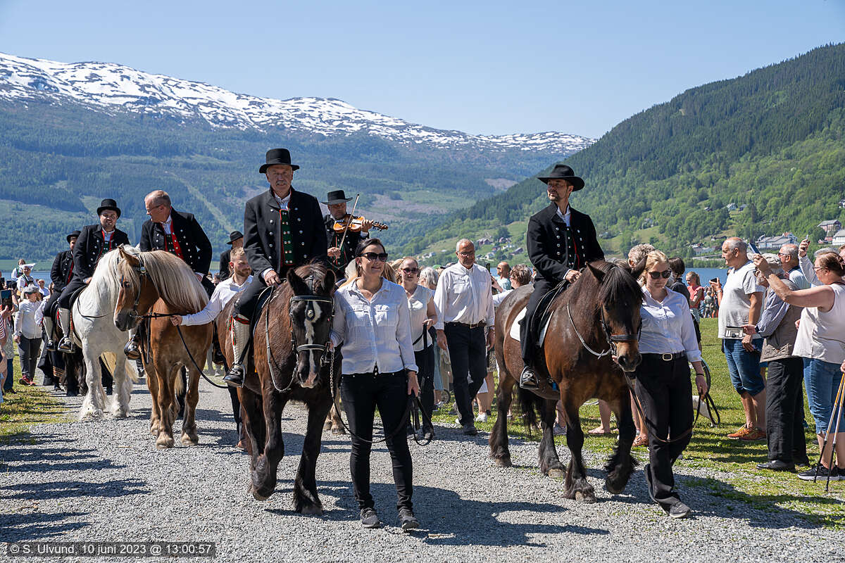 Bilete frå avdukinga av Nils Bergslien sitt monument «til minne um spelemannen Ola Msafinn og gamle ridande vossabrudlaup» og bilete frå Kjersti Nordgård og Stian Lid sitt ridande Vossabrudlaup. 10. juni 2023