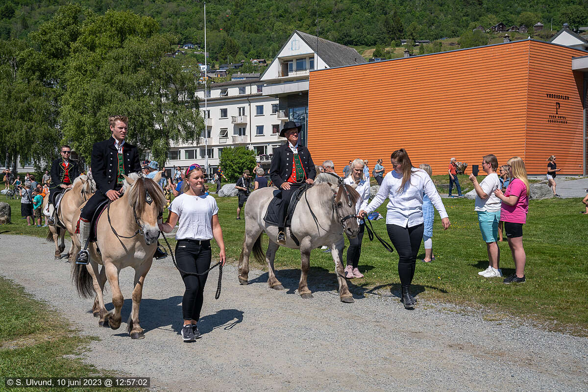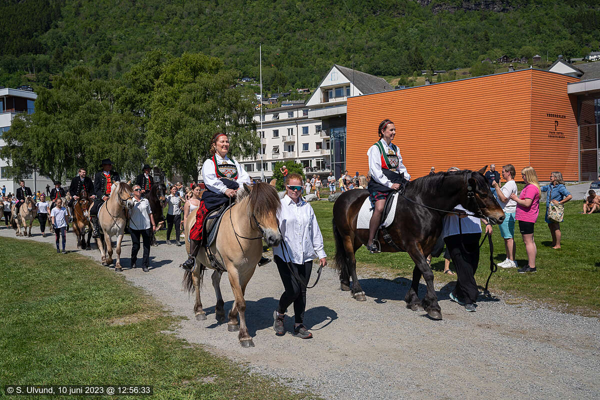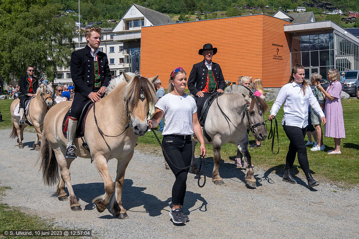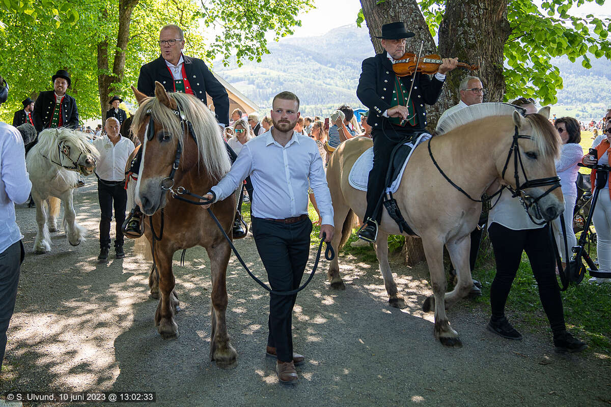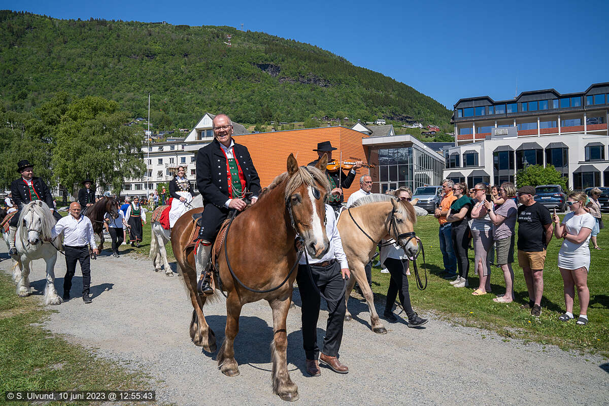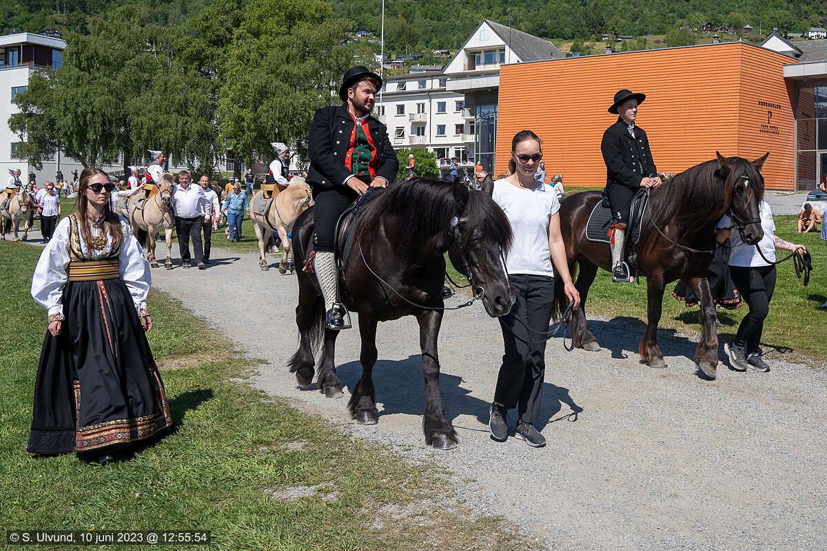 Bilete frå avdukinga av Nils Bergslien sitt monument «til minne um spelemannen Ola Msafinn og gamle ridande vossabrudlaup» og bilete frå Kjersti Nordgård og Stian Lid sitt ridande Vossabrudlaup. 10. juni 2023