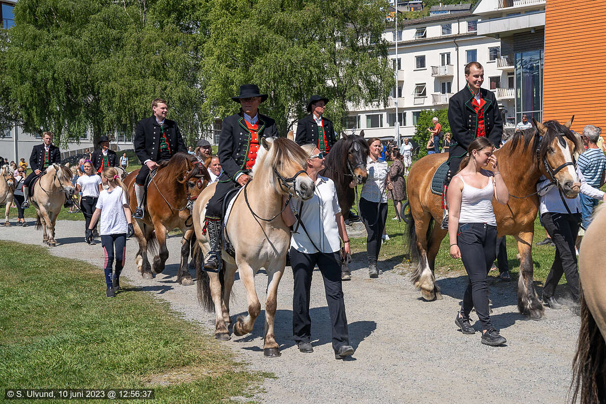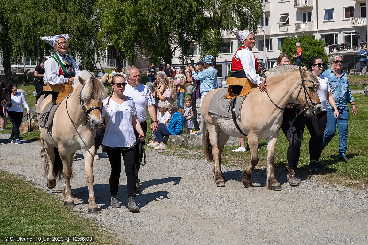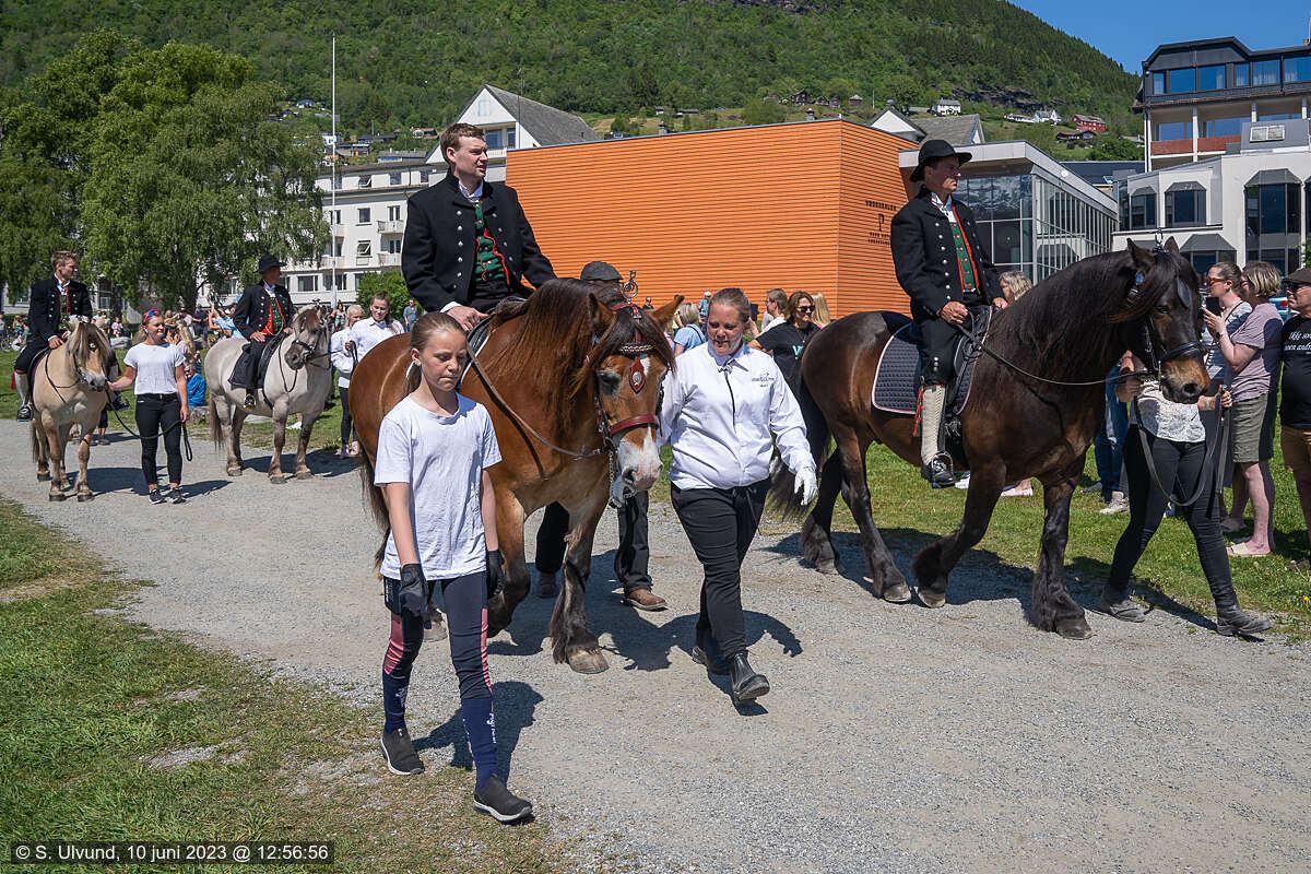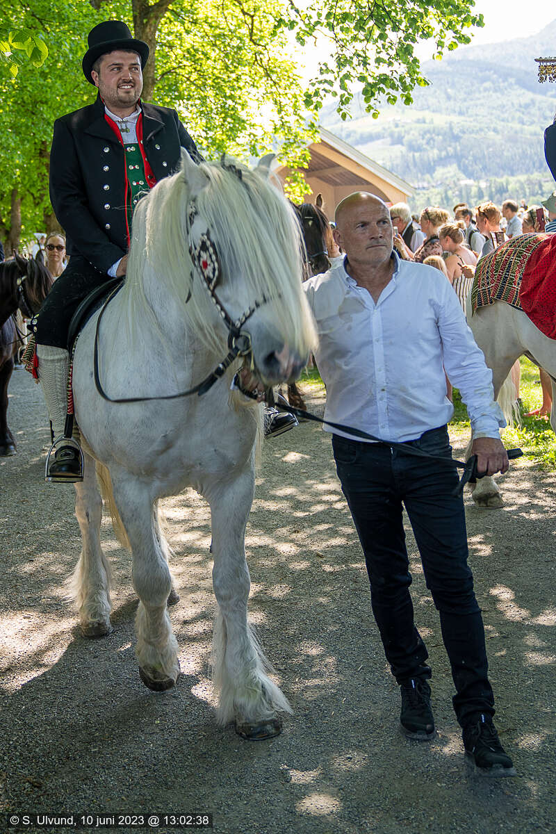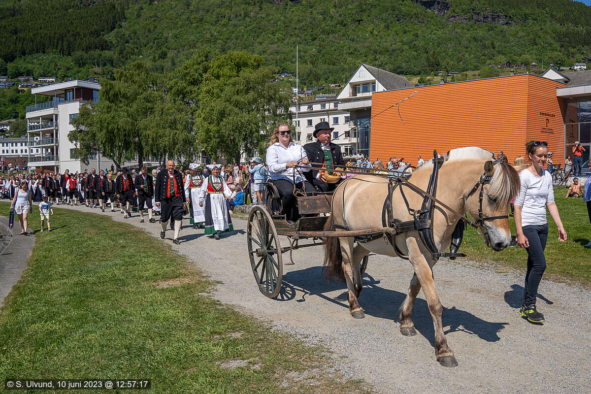 Bilete frå avdukinga av Nils Bergslien sitt monument «til minne um spelemannen Ola Msafinn og gamle ridande vossabrudlaup» og bilete frå Kjersti Nordgård og Stian Lid sitt ridande Vossabrudlaup. 10. juni 2023