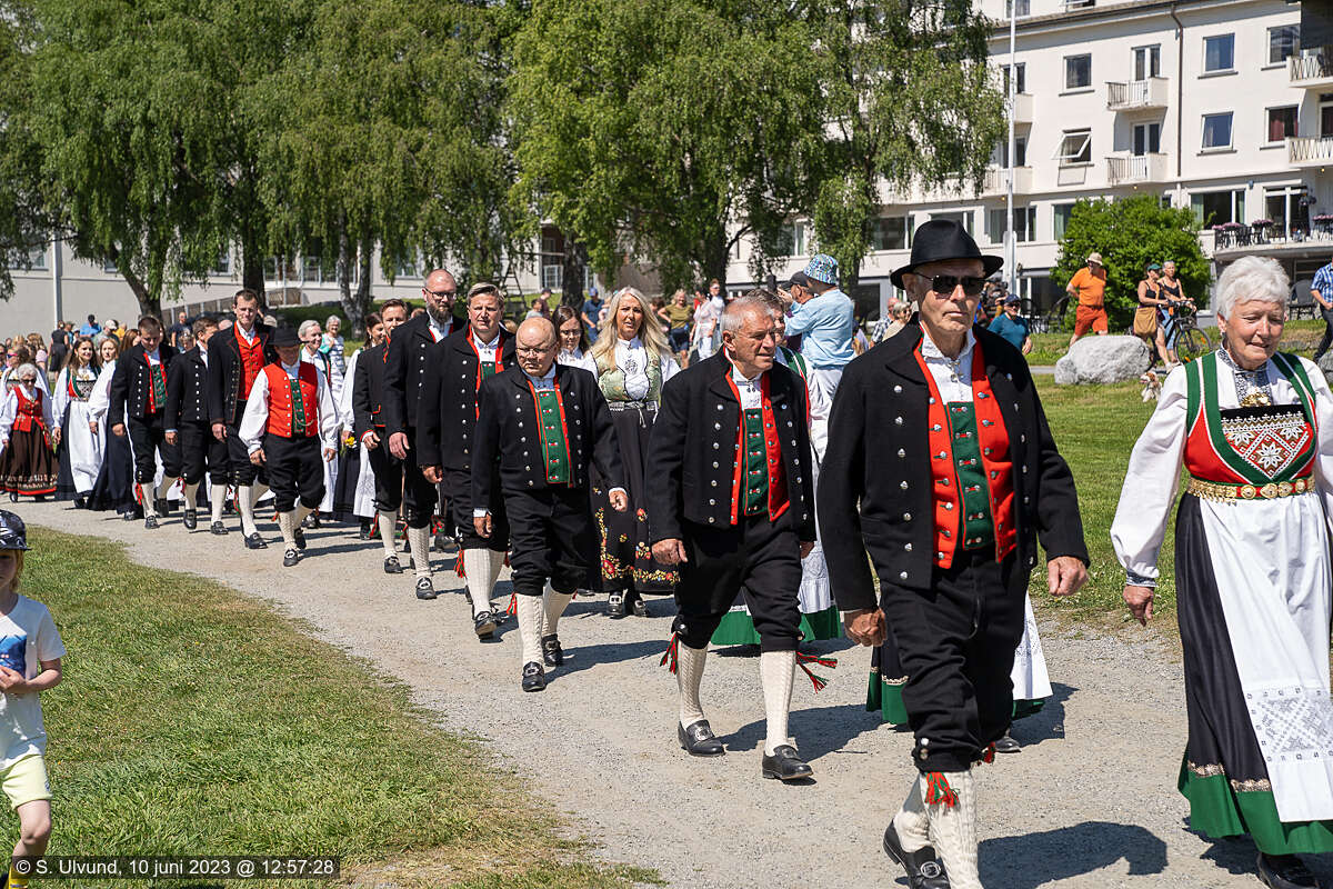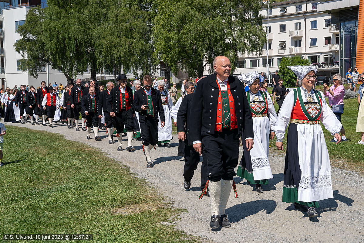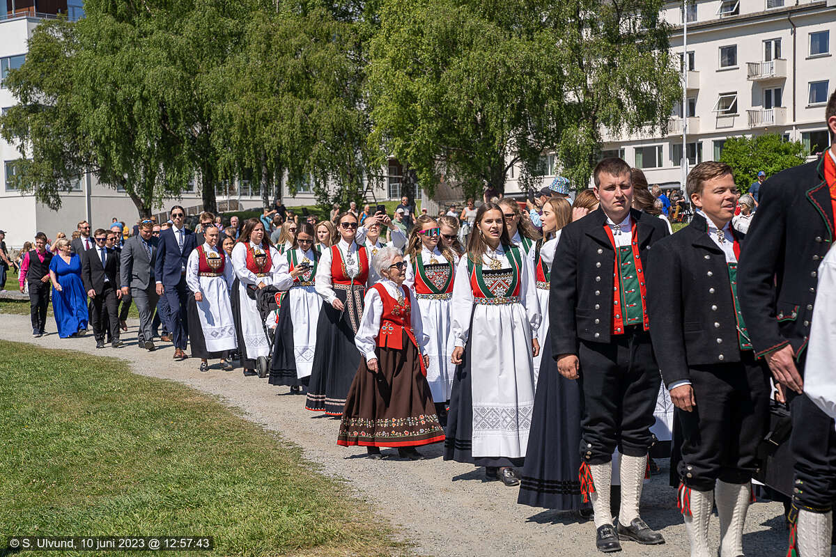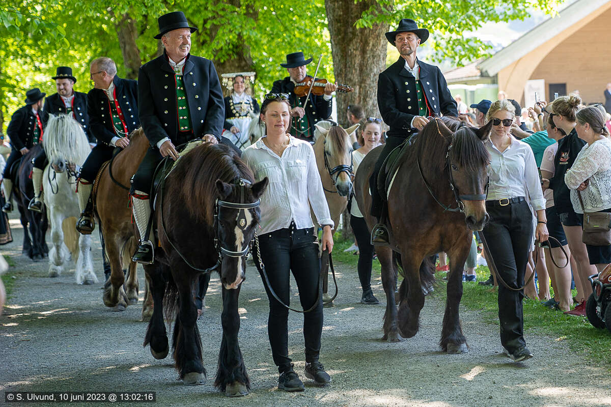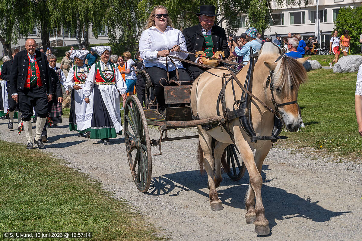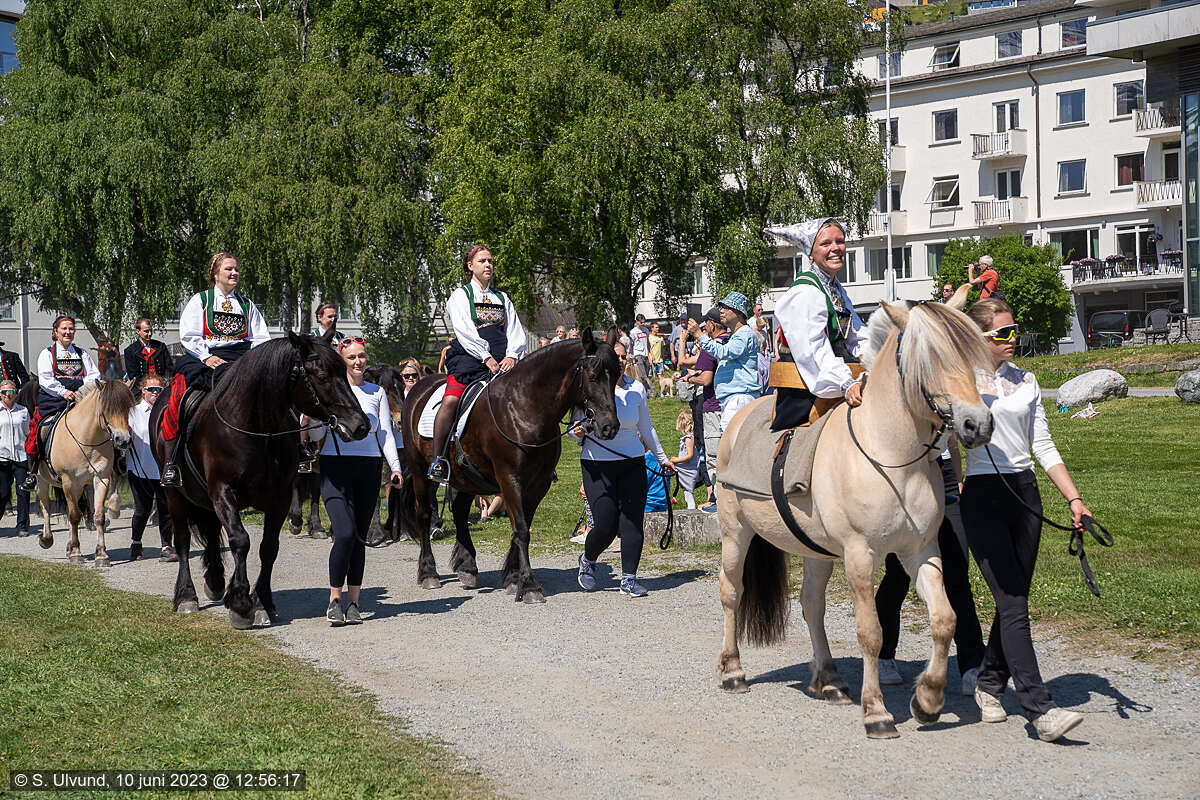 Bilete frå avdukinga av Nils Bergslien sitt monument «til minne um spelemannen Ola Msafinn og gamle ridande vossabrudlaup» og bilete frå Kjersti Nordgård og Stian Lid sitt ridande Vossabrudlaup. 10. juni 2023