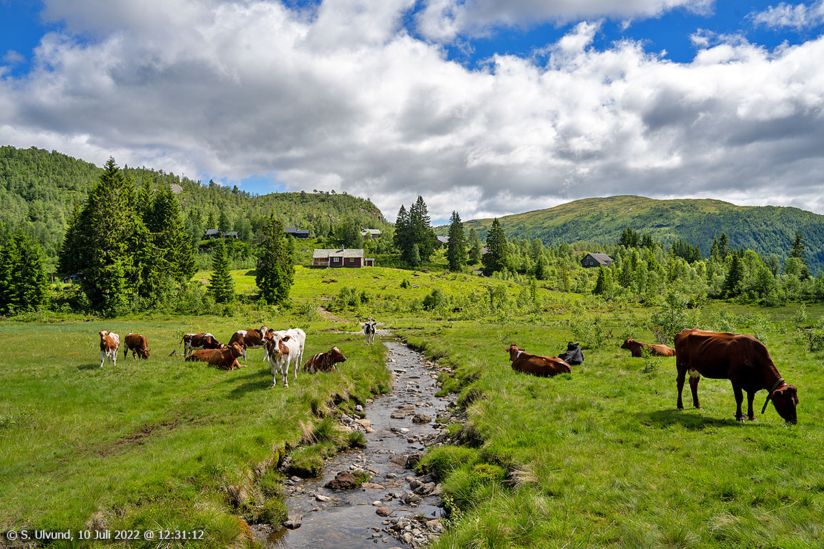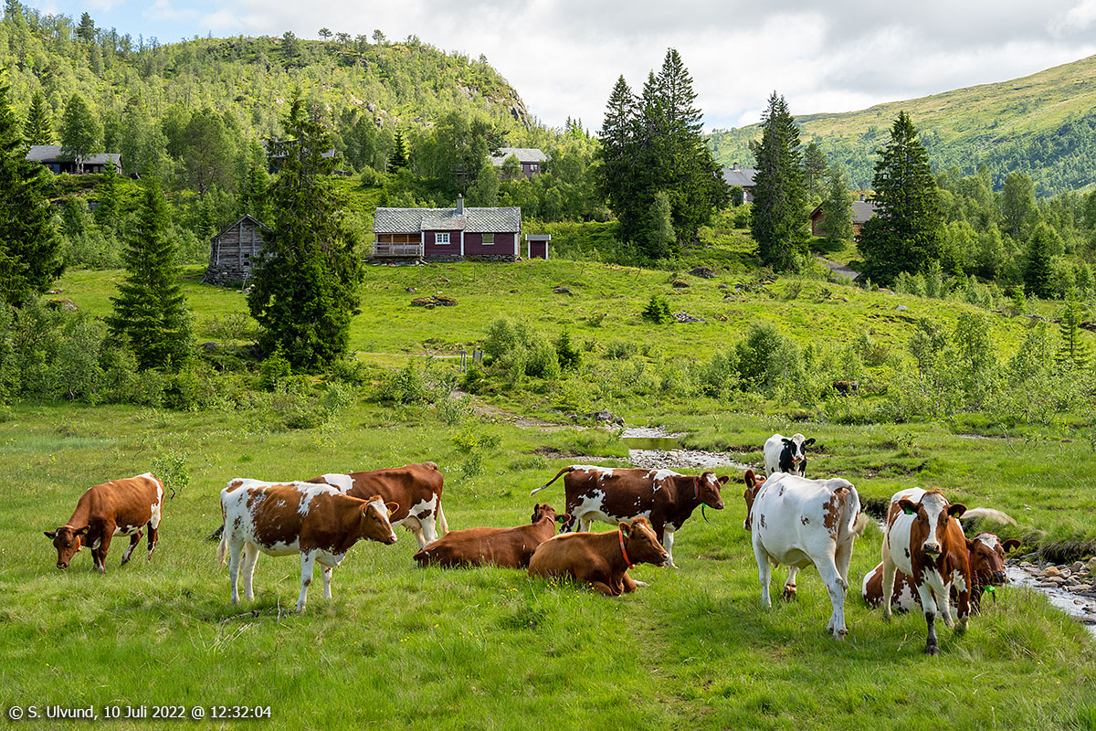 Kyr på beite ved Fjosstølen, 10. juli 2022, 12:31 (Fjosestølen, Urdland)