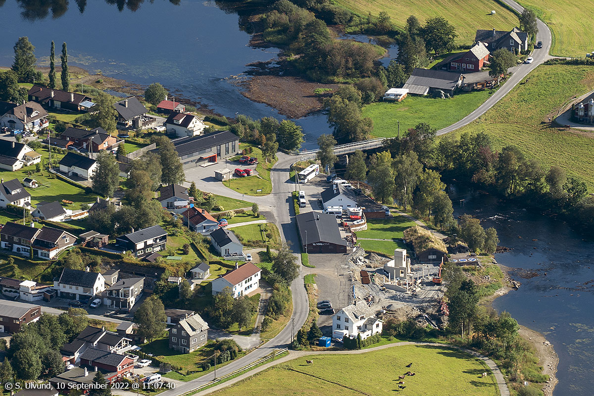 Her bygger Voss Active (Voss Raftingsenter) nytt rafting Hotel sett frå Hangurstoppen, 10. september 2022, 11:07 (Hanguren, Skulestadmo)