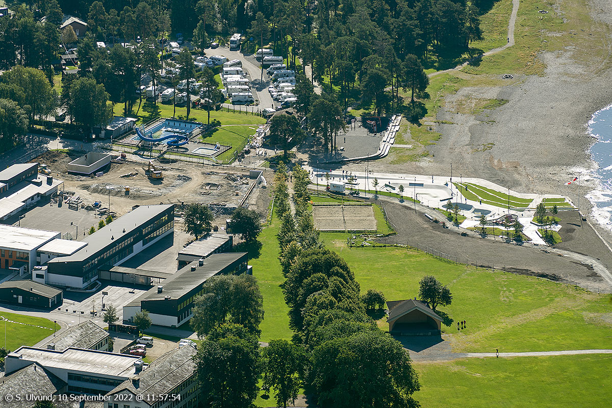 Her ved Voss Ungdomsskule skal det koma ny idretts- og skulefløy sett frå Hanguren rett ved sida av ligg Voss Aktivitetspark og Treningsparken, 10 september 2022, 11:57, +12C (Voss)