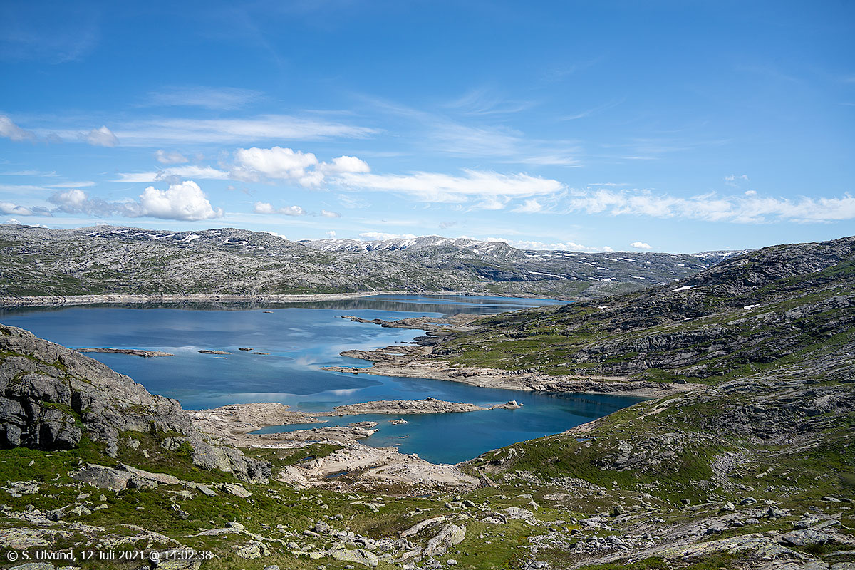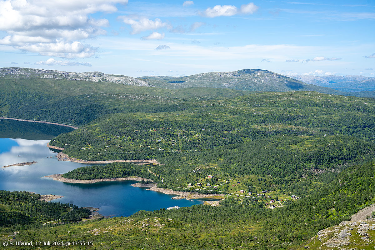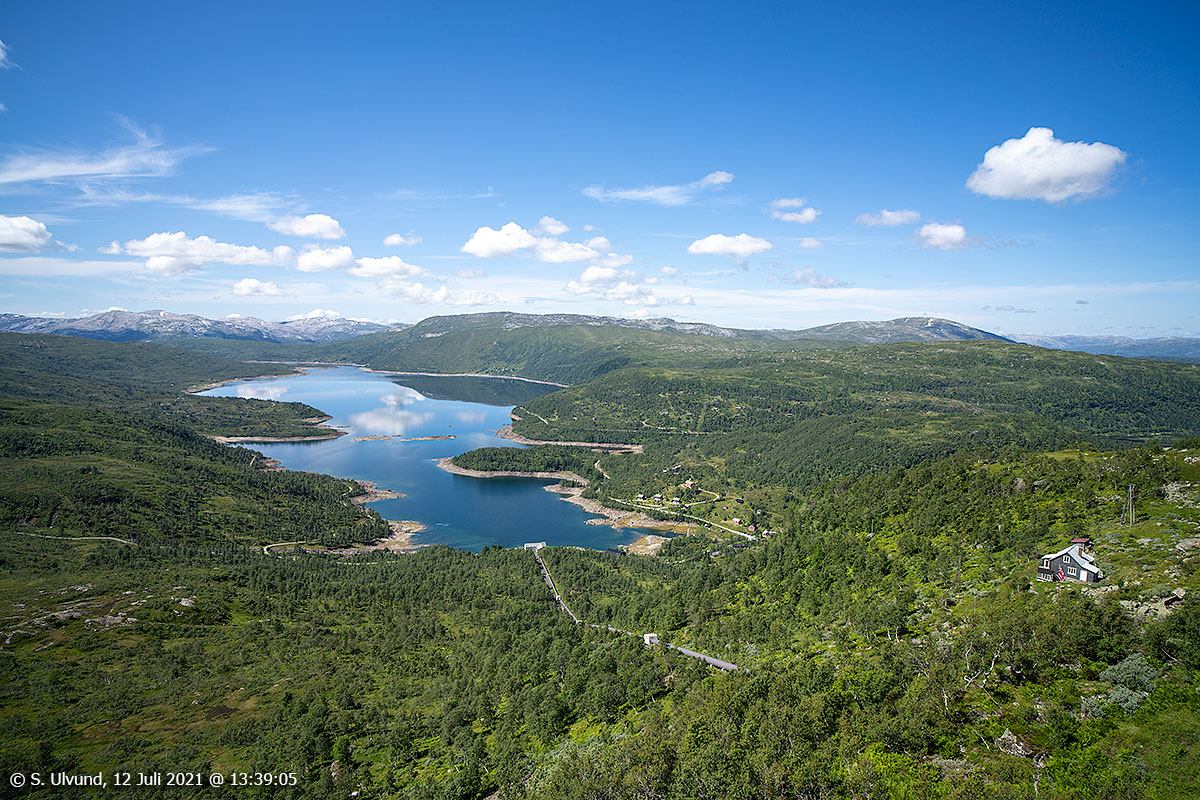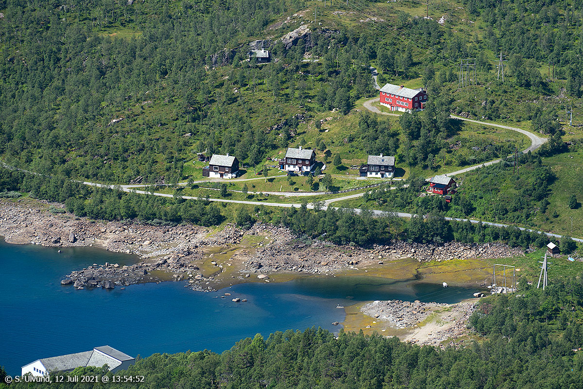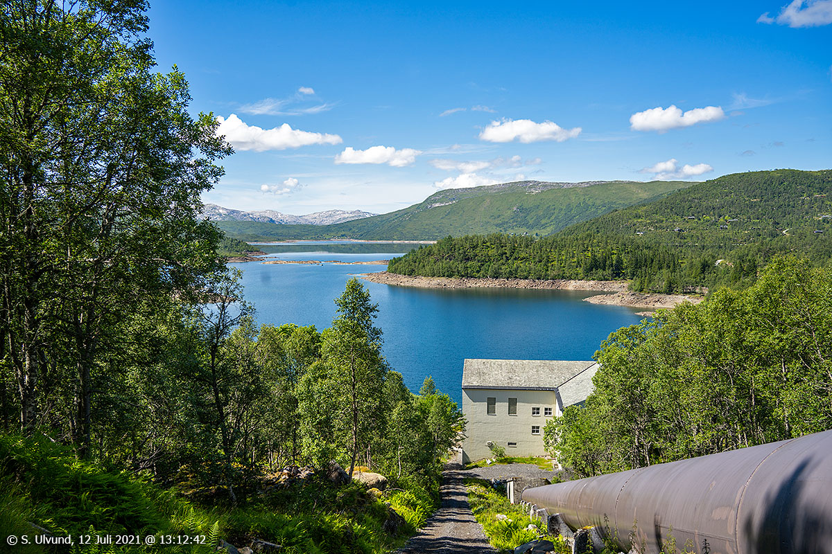 Hodanberg kraftverk og røyrgate med Hamlagrøvatnet bak, 12. juli 2021, 13:12