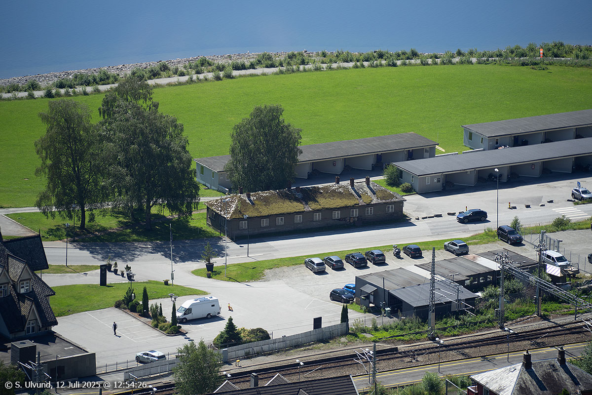 Evangervegen med den gamle Tyskerbrakka, 12. juli 2025, 12:54, +28C Om ikkje lenge skal den gamle Tyskerbrakka rives/brennes.