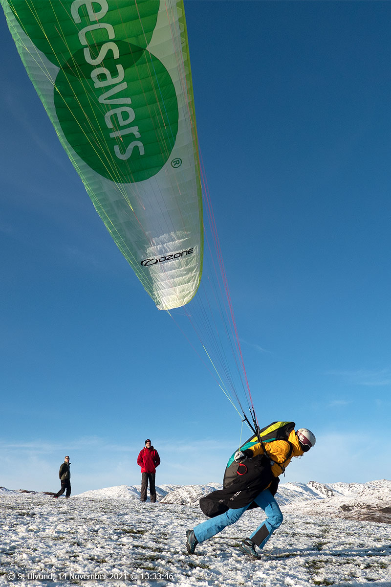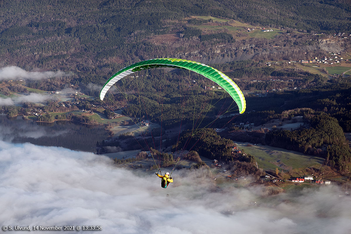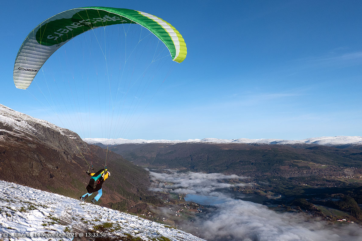 Paraglider på veg ut frå Hangurstoppen, 14. november 2021, 13:33