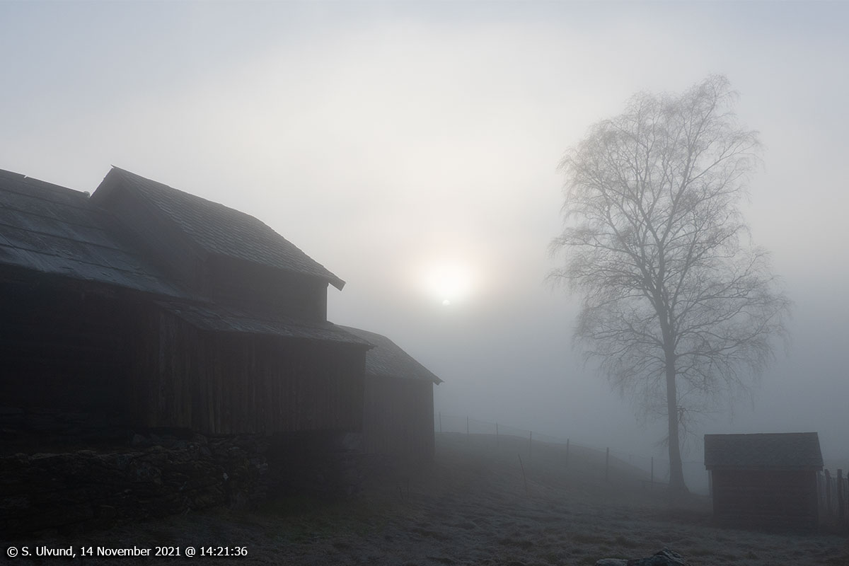 Nede under skodda, trolsk stemning ved Mølstertunet, 14. november 2021, 14:21, -1C (Voss)