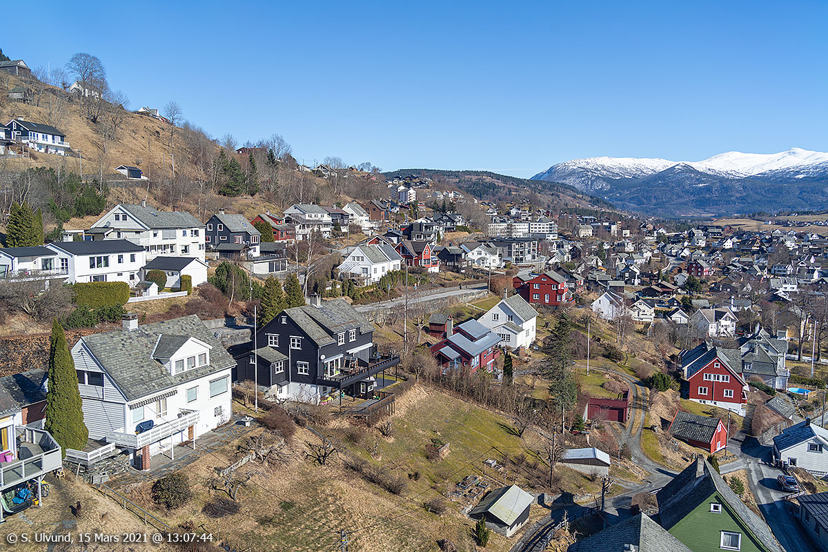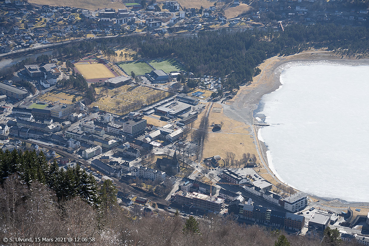 Voss sentrum frå Hanguren, 15. mars 2021, 12:06, +2C (Hangursrestauranten)