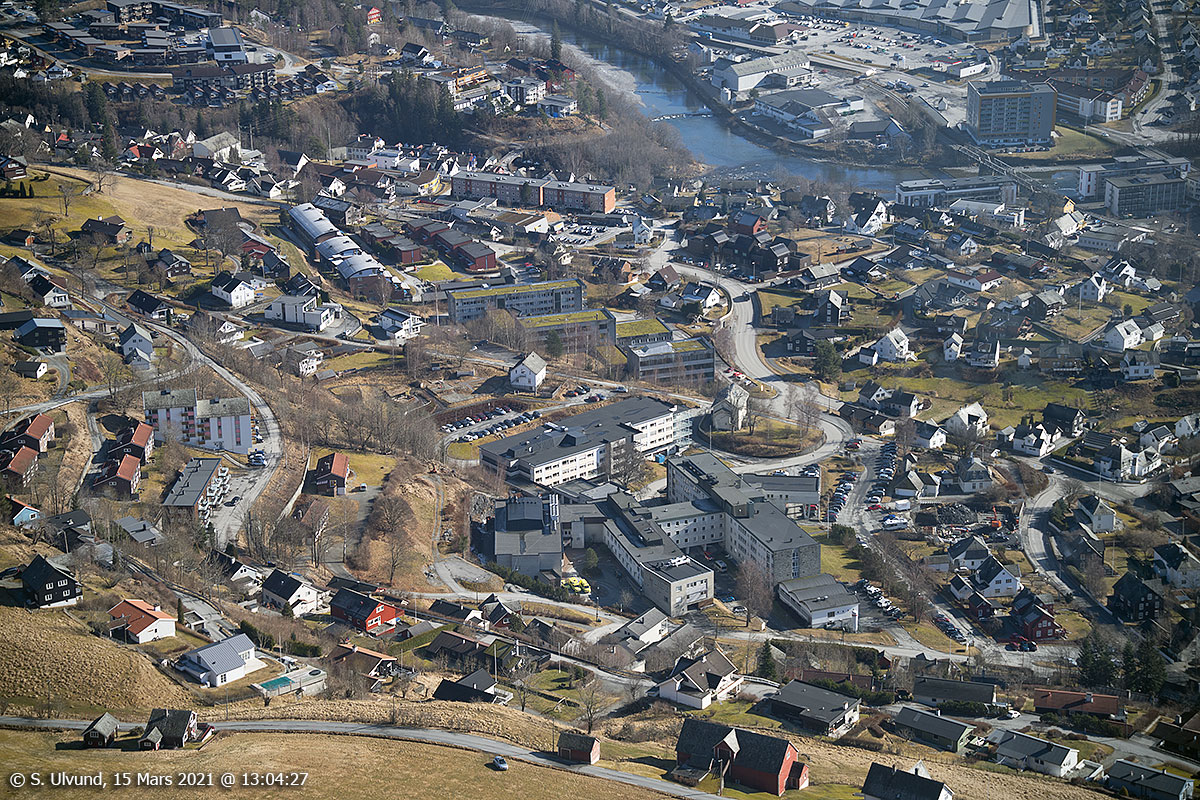 Voss Sjukehus sett frå Voss Gondol, 15. mars 2021, 13:04, +3C (Lekvebakken Rognsbakken Sivlevegen Ringheimsvegen Lundarvegen Rogne)