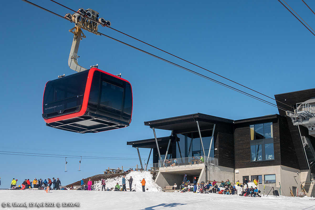 Hangurstoppen mot Voss Gondol og Hangurstoppen Restaurant, 15. april 2021, 12:00, 0C (Hanguren, Voss)