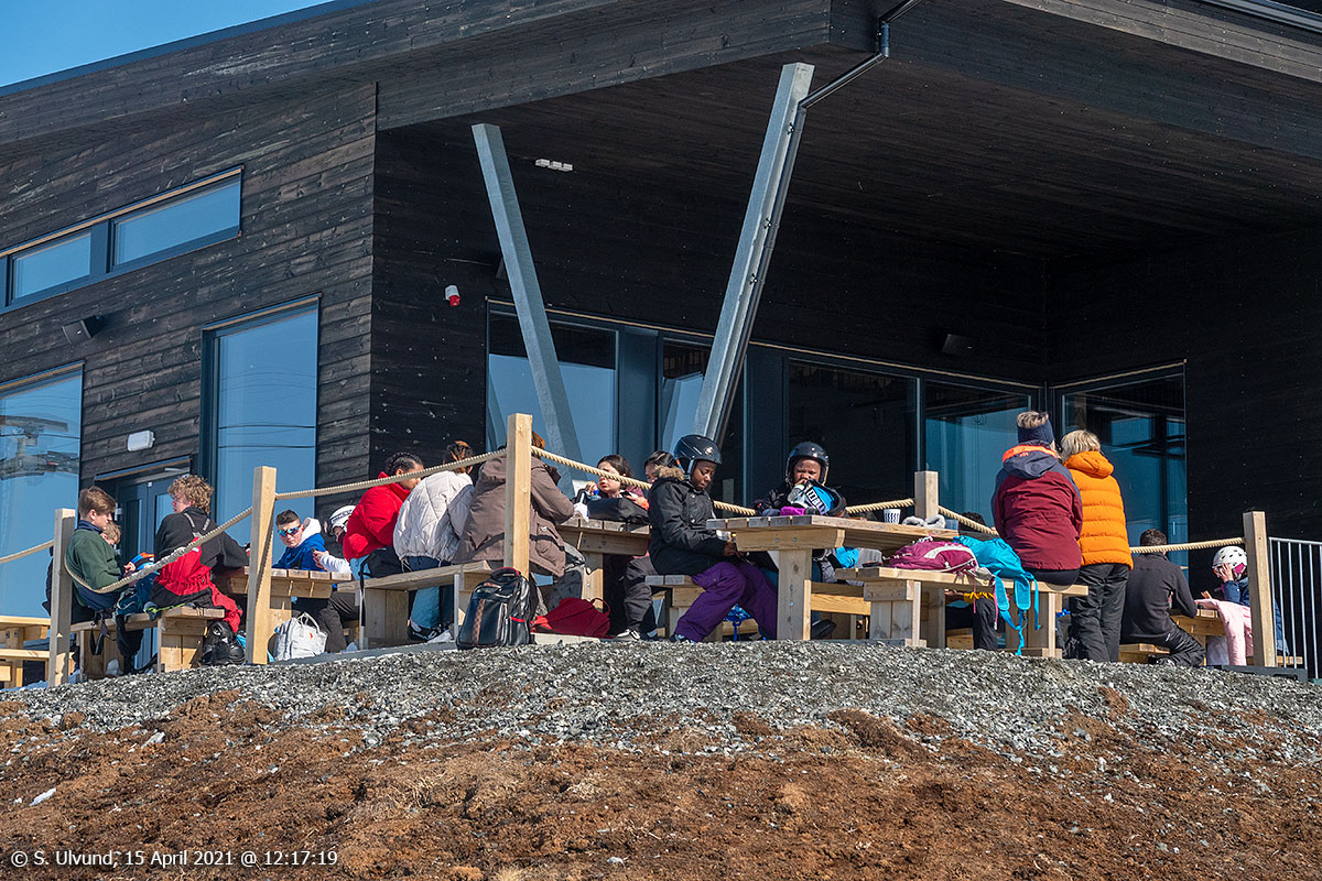 I solveggen på Hangurstoppen utanfor Voss Gondol og Hangurstoppen Restaurant, 15. april 2021, 12:00, 0C (Hanguren, Voss)