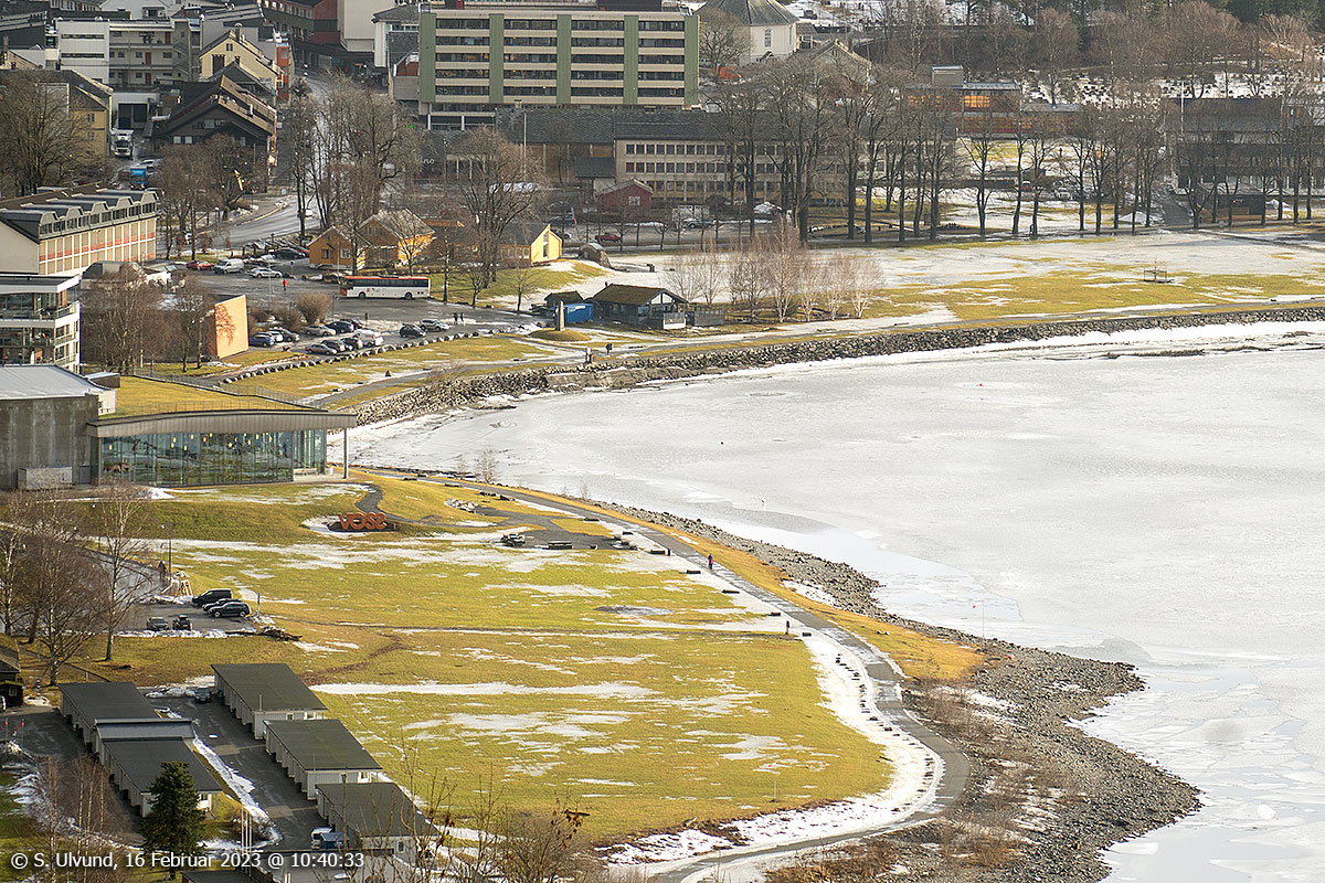 Holbergsplassen og Prestegardslandet sett frå Raugstadvegen, 16. februar 2023, 10:40, +3C (Voss)