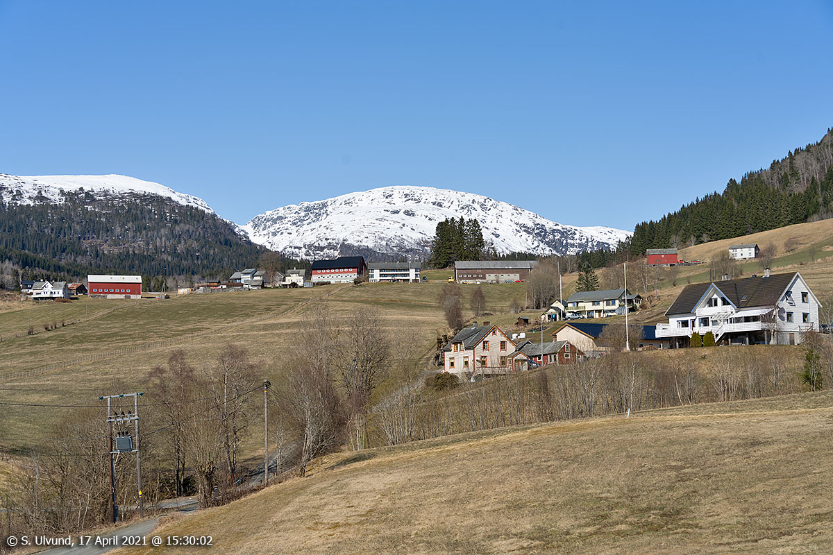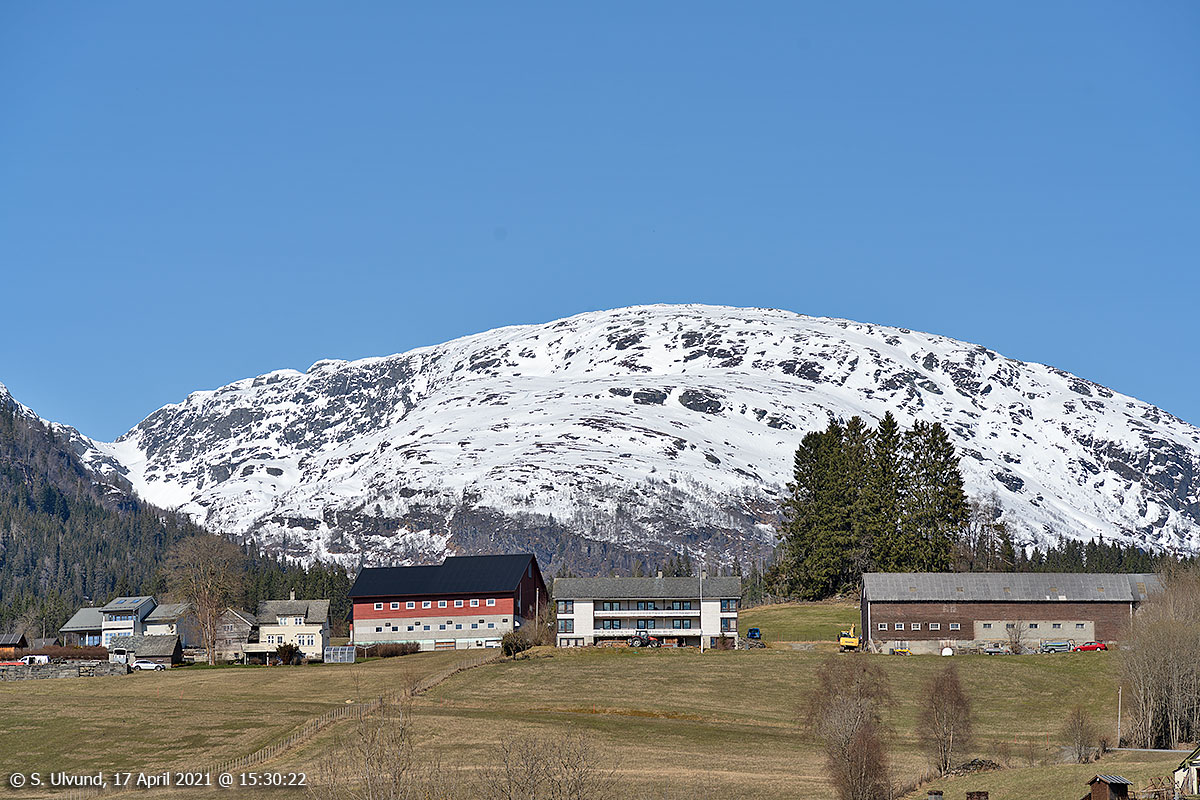 Gjerstad (Dyrvedalen) med Tvarafjellet bak, 17. april 2021, 15:30, +14C (Voss-Bulken)