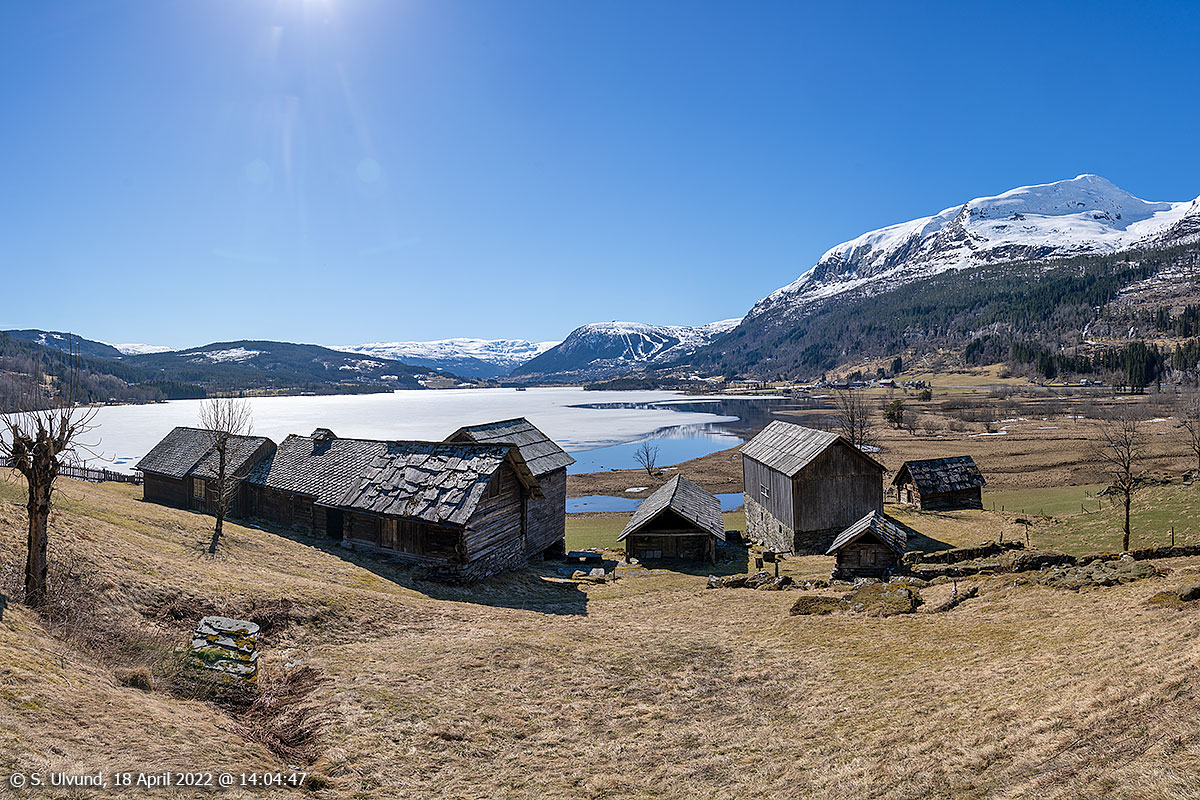 Nesheimstunet (Voss Folkemuseum) med Lønavatnet og Lønahorgi bak, 18. april 2022, 14:04, +18C (Reppen, Skulestadmo)