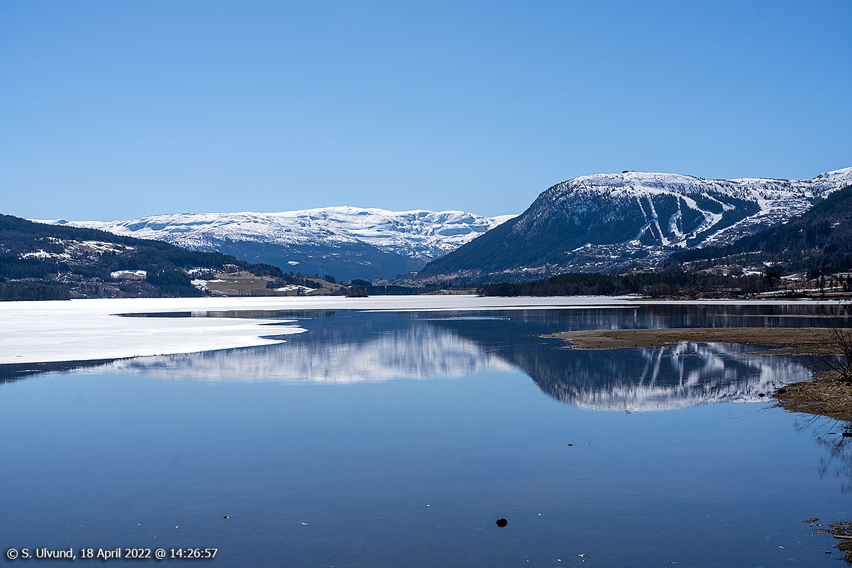 Lønavatnet med Gråsida og Hangurstoppen bak sett frå Nesheim (Reppen), 18. april 2022, +18C (Skulestadmo)