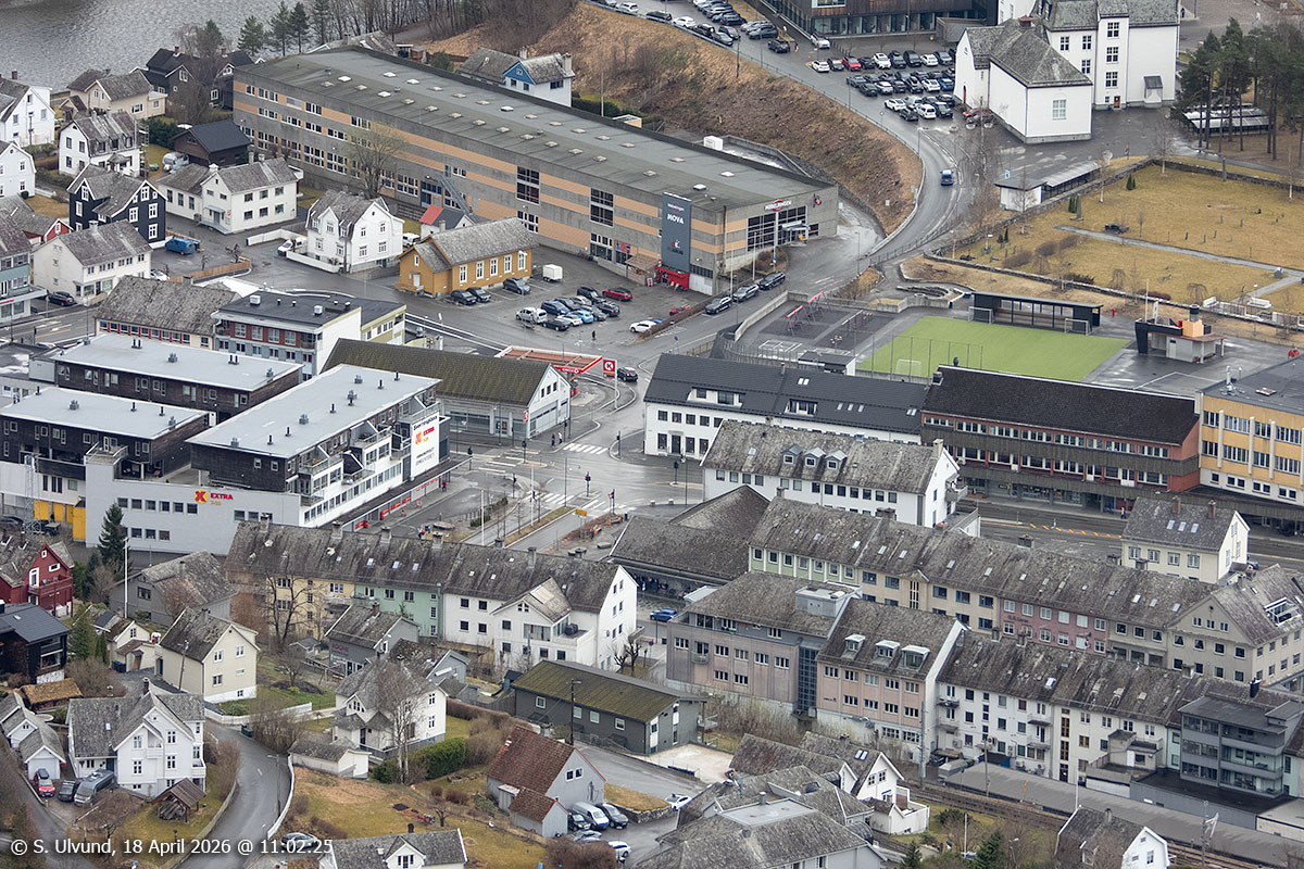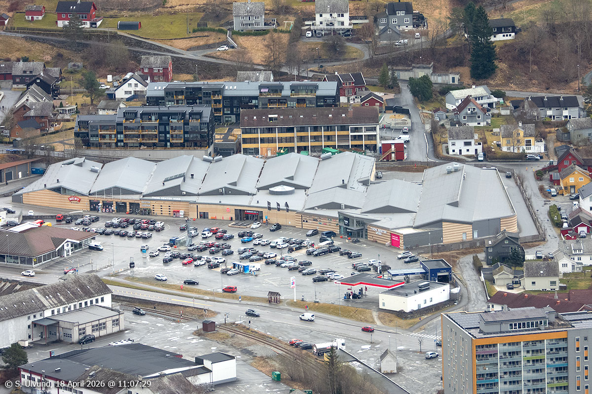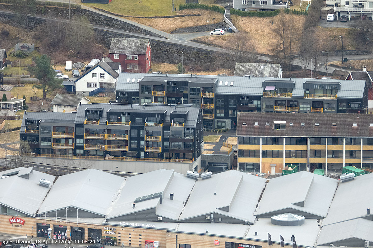 Thon Senter Voss og Vatletun (BOB) sett frå Mølsterberget, 18. april 2026, 11:07, +9C (Haugamoen, Voss)