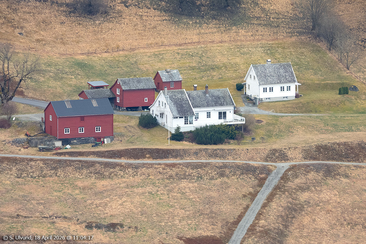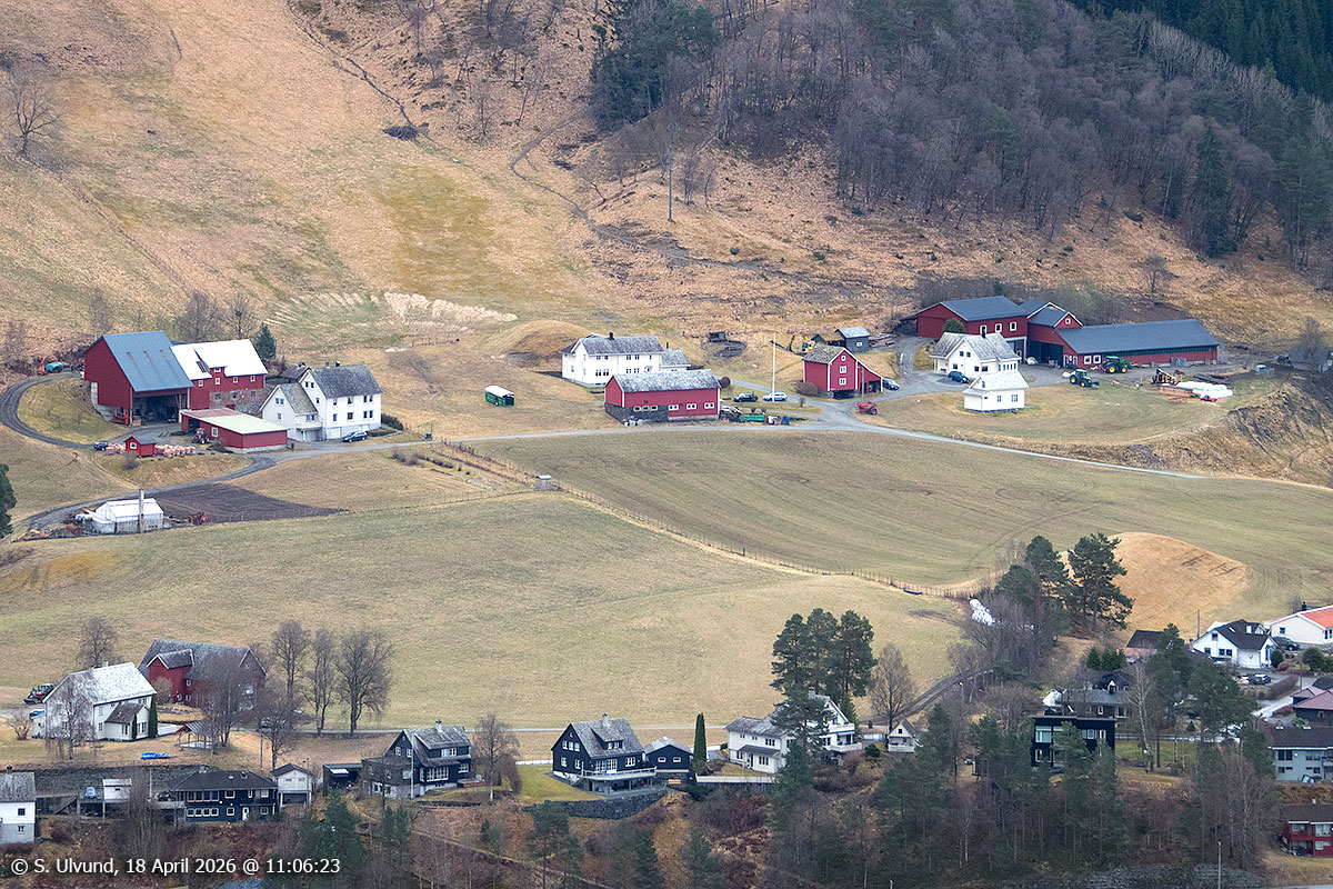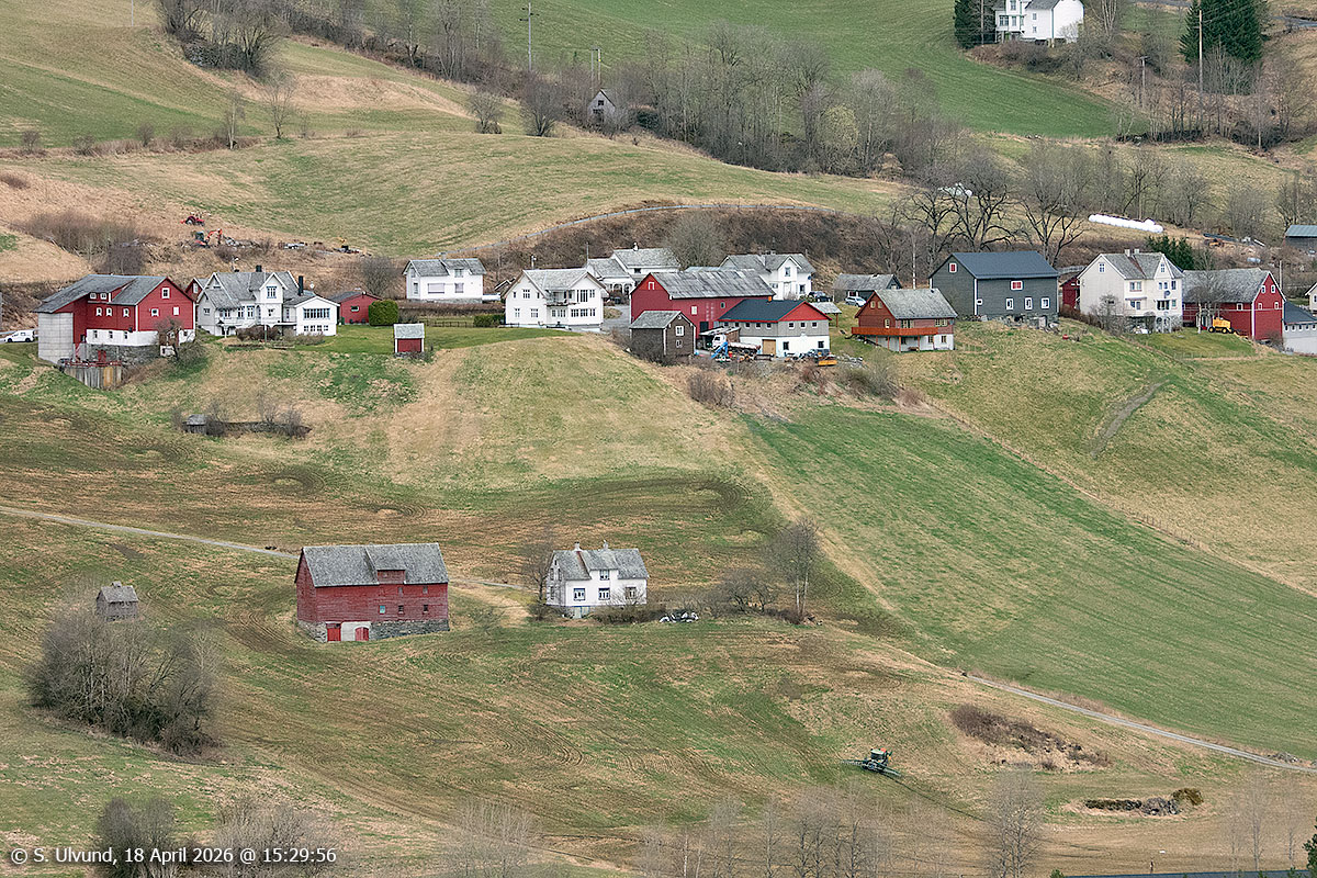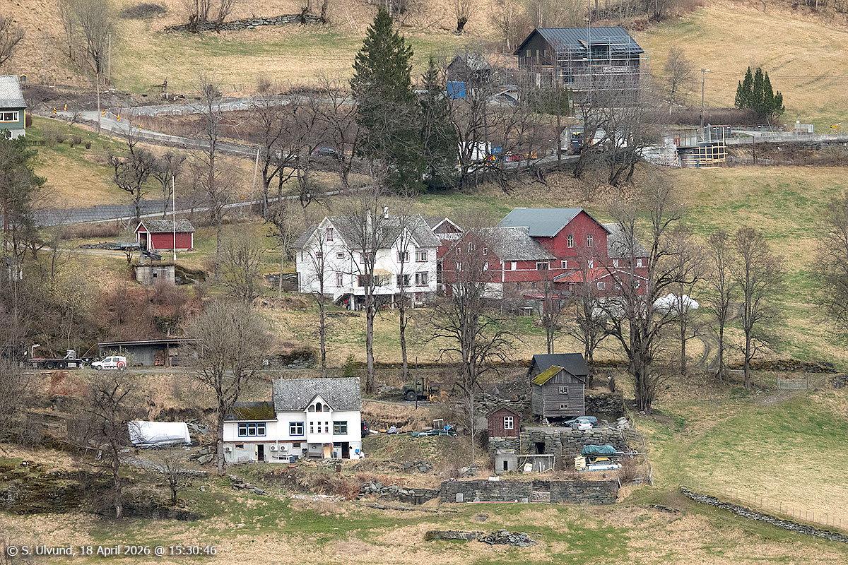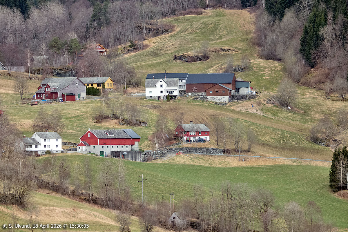 Hylle og Bakketun sett frå Kvitlii (Skutlesvegen), 18. april 2026, 15:29, +12C (Palmafossen)