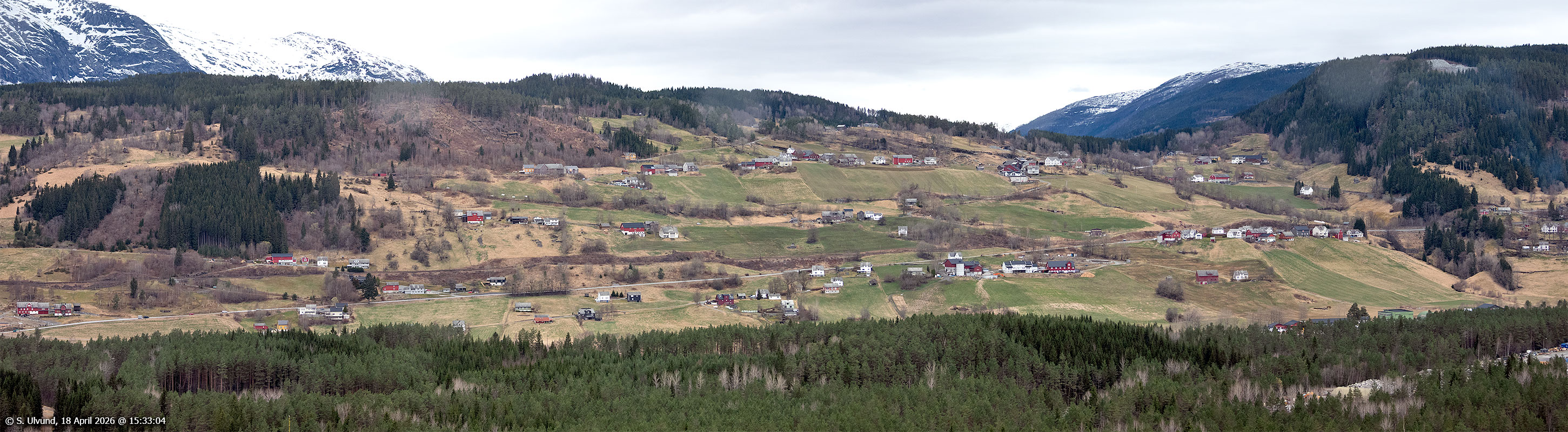 Tjukkebygdi sett frå Kvitlii (Skutlesvegen), 18. april 2026, 15:33, +12C (Palmafossen)