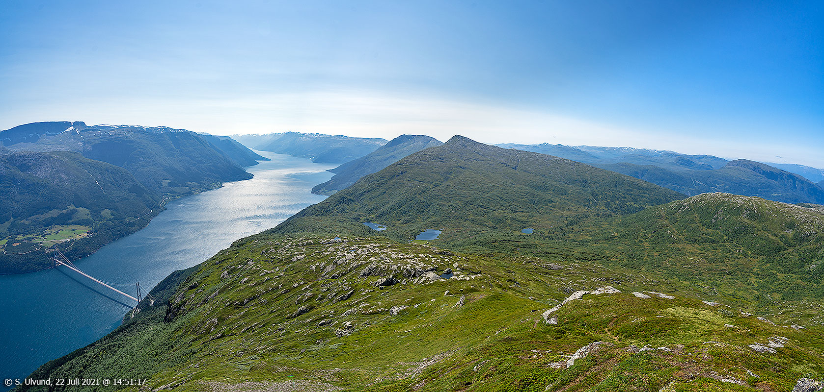 Hardangebrua, Eidfjorden, Sørfjorden, (Demmo og Dalsetetjørni) Stokkseldalen, Ingebjørgfjellet og Oksen sett frå Disk,