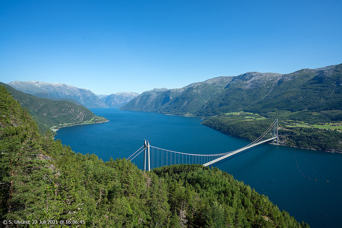 Hardangerbrua og Eidfjorden sett ovanfor Vallaviki, 22. juli 2021, 16:06