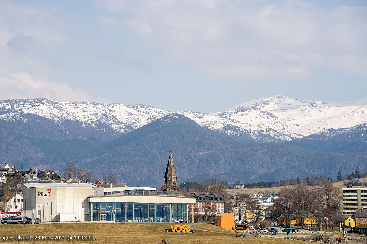 Voss Kulturhus med Sollikamben, Gretteggi og Vatnaknausen bak, 23. mars 2025, 14:13, +11C