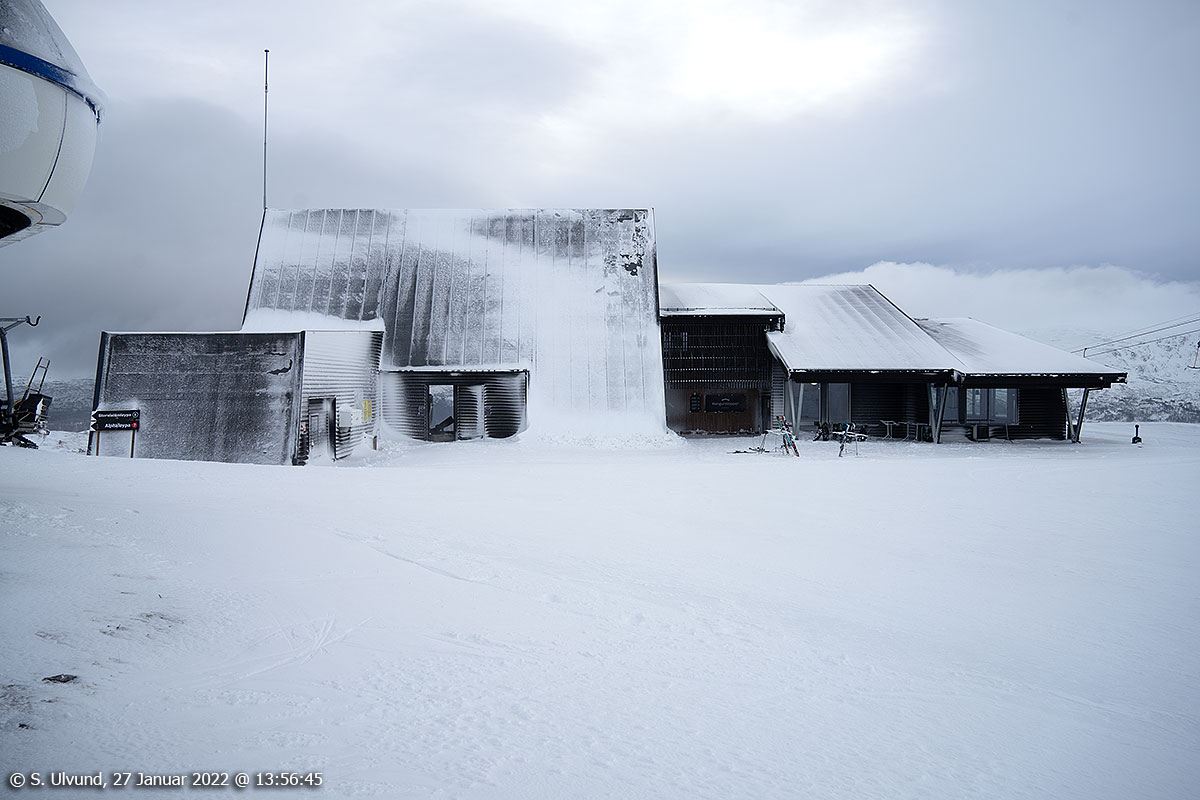 Hangurstoppen mot Voss Gondol og Hangurstoppen Restaurant, 27. januar 2022, 13:56, -2C (Hanguren, Voss)