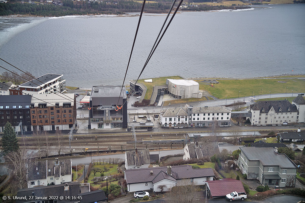 Voss Stasjon, Voss Gondol og Voss Kulturhus sett frå Voss Gondol, 27. januar 2022, 14:16, +5C (Voss)