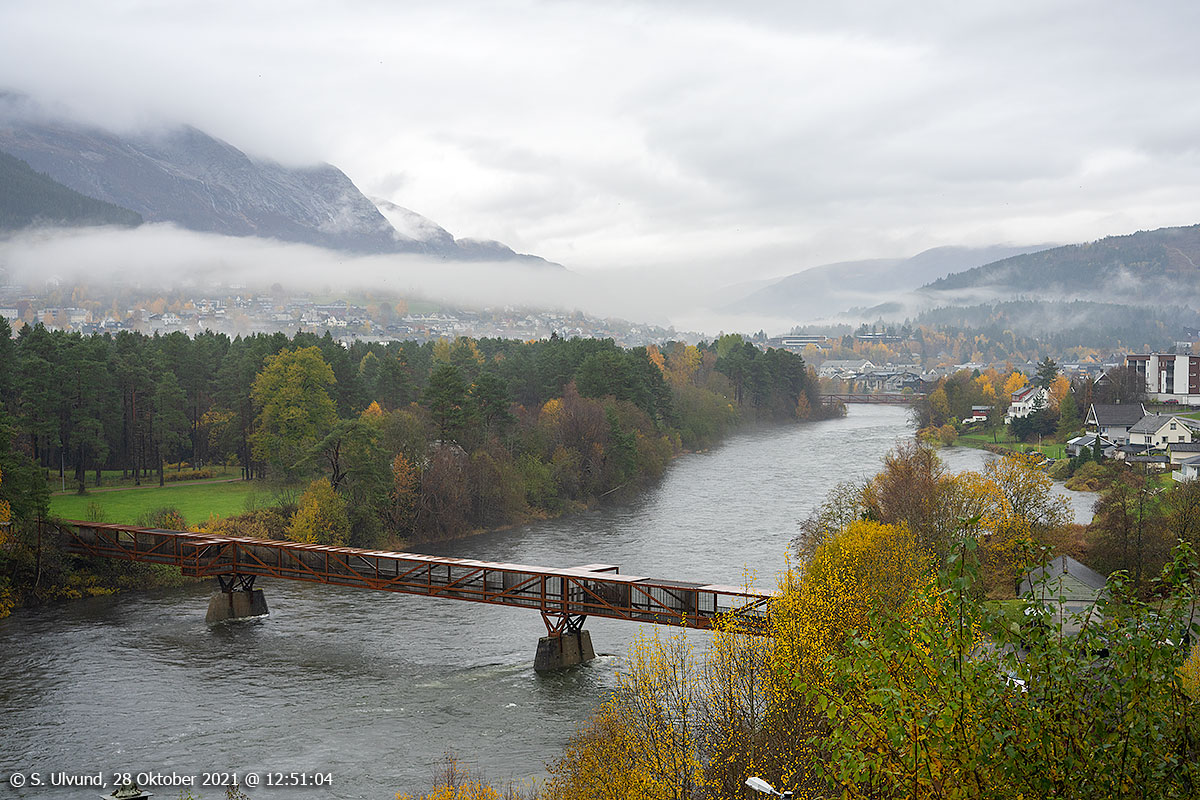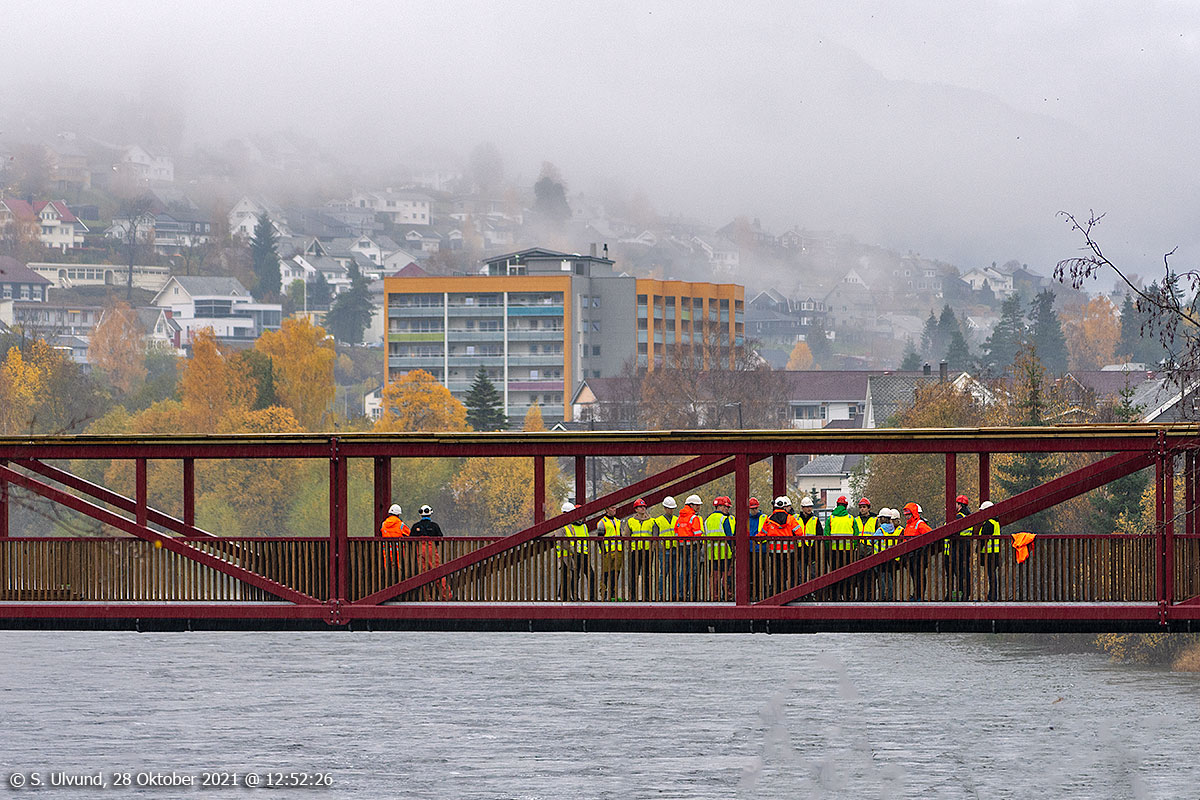 Bru konferanse! på nye gangbrua over Vosso frå Nyresfeltet til Prestegardsmoen, 28. oktober 2021, 12:52, +9C (Voss)