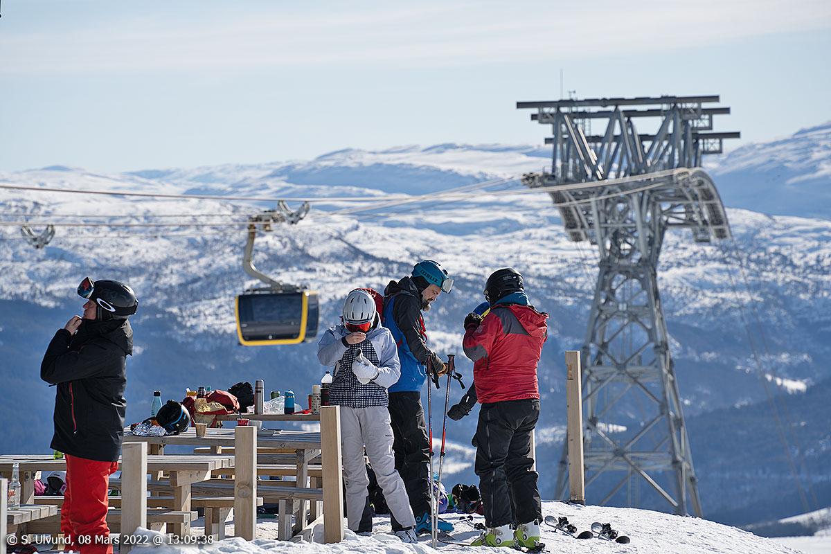Biletglimt frå ein strålandes flott dag med reine påskestemninga i sola. Tråstølen. Paraglidere på Hangurstoppen og Skulestadmo frå Hangurstoppen. Hangurstoppen