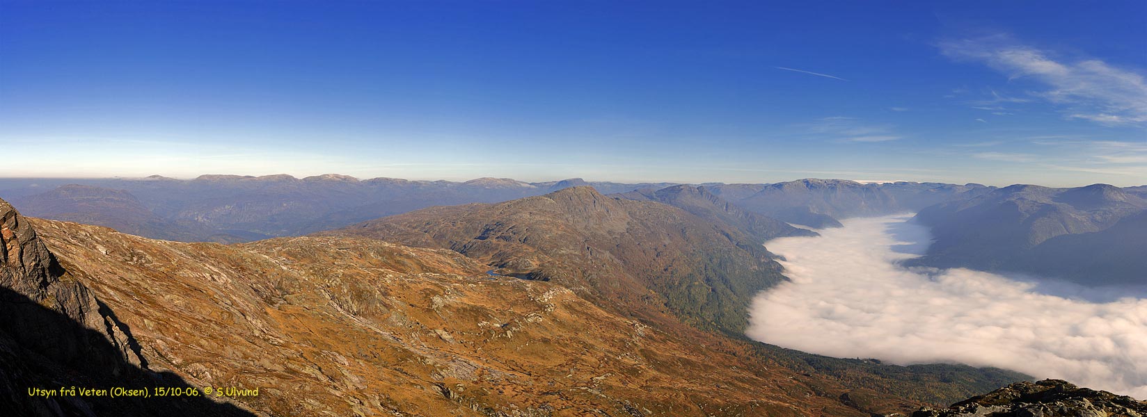 (Panorama) Utsyn frå Veten (Oksen) mot nesheimshorgi Granvinsvatnet Oksatnørni Larsbu Refjellet (Redfjellet) Ingebjørgfjellet Midtfjellet Vassfjøro Hardangerjøkulen og Eidfjorden under skoddehavet (Ullensvang) (Oktober 2006)