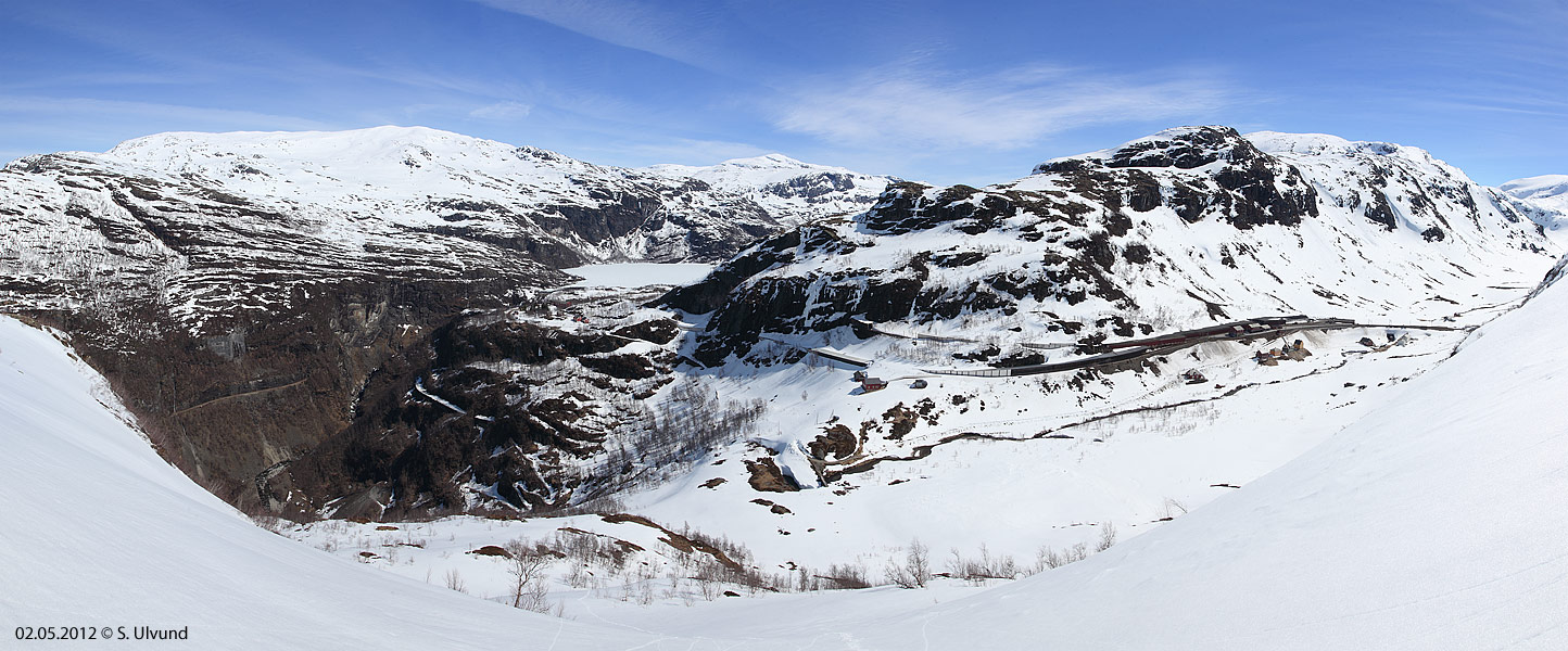 (Panorama) Utsyn mot Sjebergsnuten Tarven Flåmsbana Bergensbana Leite Myrhallen Vatnahalsen Hotel Reinungavatnet Husdalsnosi Eitrefjellet Geitafjellet Myrdal Stasjon Myrdalen og Broksnosi frå parti på Urdshovd (Mai 2012)