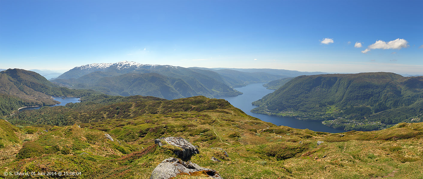 (Panorama) Hananipa mot Skulstadvatnet Gullfjellet Trengereidhotten Sørfjorden Osterøyni (Juni 2014)